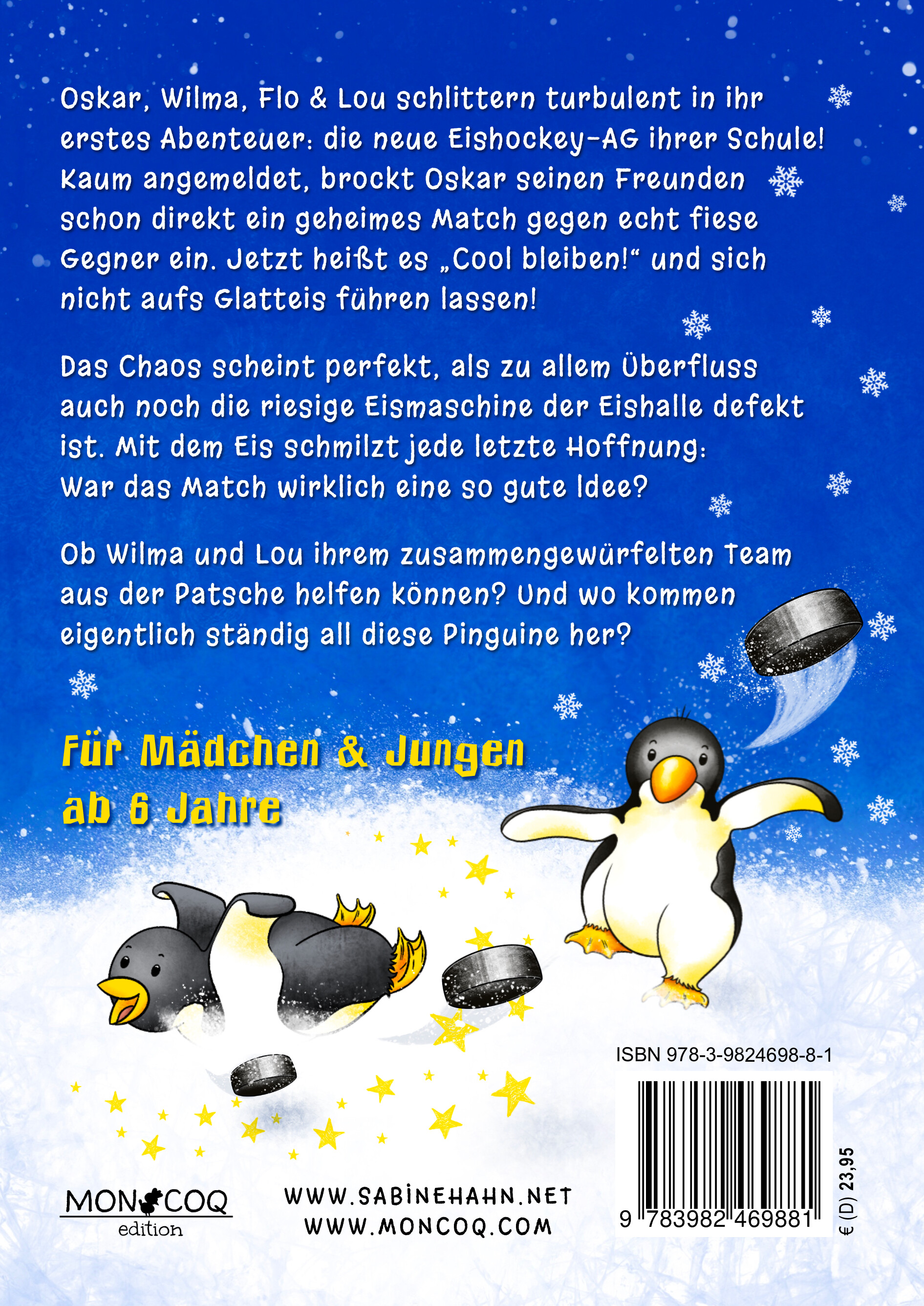 Die Autorin und Illustratorin Sabine Hahn: Ausgezeichnet mit dem Deutschen Lesepreis 2024 für ihr außergewöhnliches Engagement zur wechselseitigen Förderung des Lesens und des Hockeysports im Kindesalter, widmet sich Sabine Hahn neben ihrer erfolgreichen internationalen Kinderbuchreihe der „Hockey-Kids“ nun ebenfalls dem Eishockeysport, um Kinder mit den „Eishockey-Kids“ sowohl für das Lesen als auch für das Eishockeyspielen zu begeistern. Seit 2014 besucht die Halbfranzösin mit ihren interaktiven Autorenlesungen Schulen und Vereine im In- und Ausland und verzaubert Kinder mit ihrem bunten Mitmach-Programm. Informationen über die Autorin & Illustratorin Sabine Hahn und über ihre interaktiven Autorenlesungen sind auf www.sabinehahn.net zu finden.