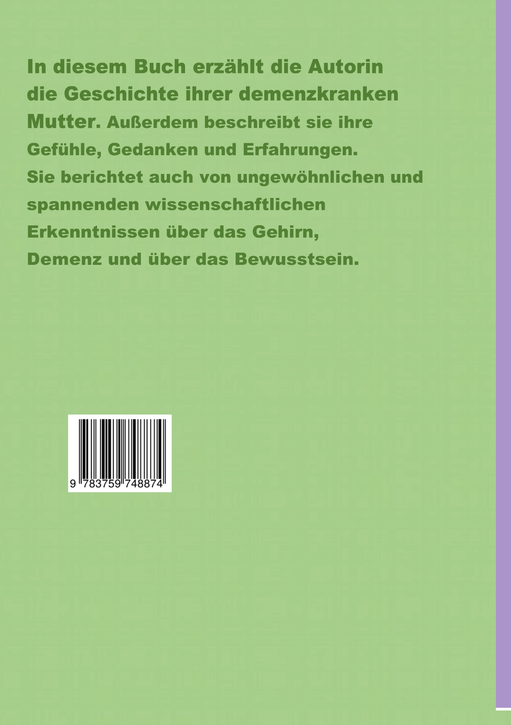 In dem Buch "Leben mit Demenz" erzählt die Autorin die Geschichte ihrer demenzkranken Mutter, und sie beschreibt auch ihre eigenen Gefühle, Gedanken und Erfahrungen der vergangenen Jahre. Weiters berichtet sie auch über spannende und ungewöhnliche wissenschaftliche Erkenntnisse über das Gehirn, das Bewusstsein und wie man gesund altern kann.