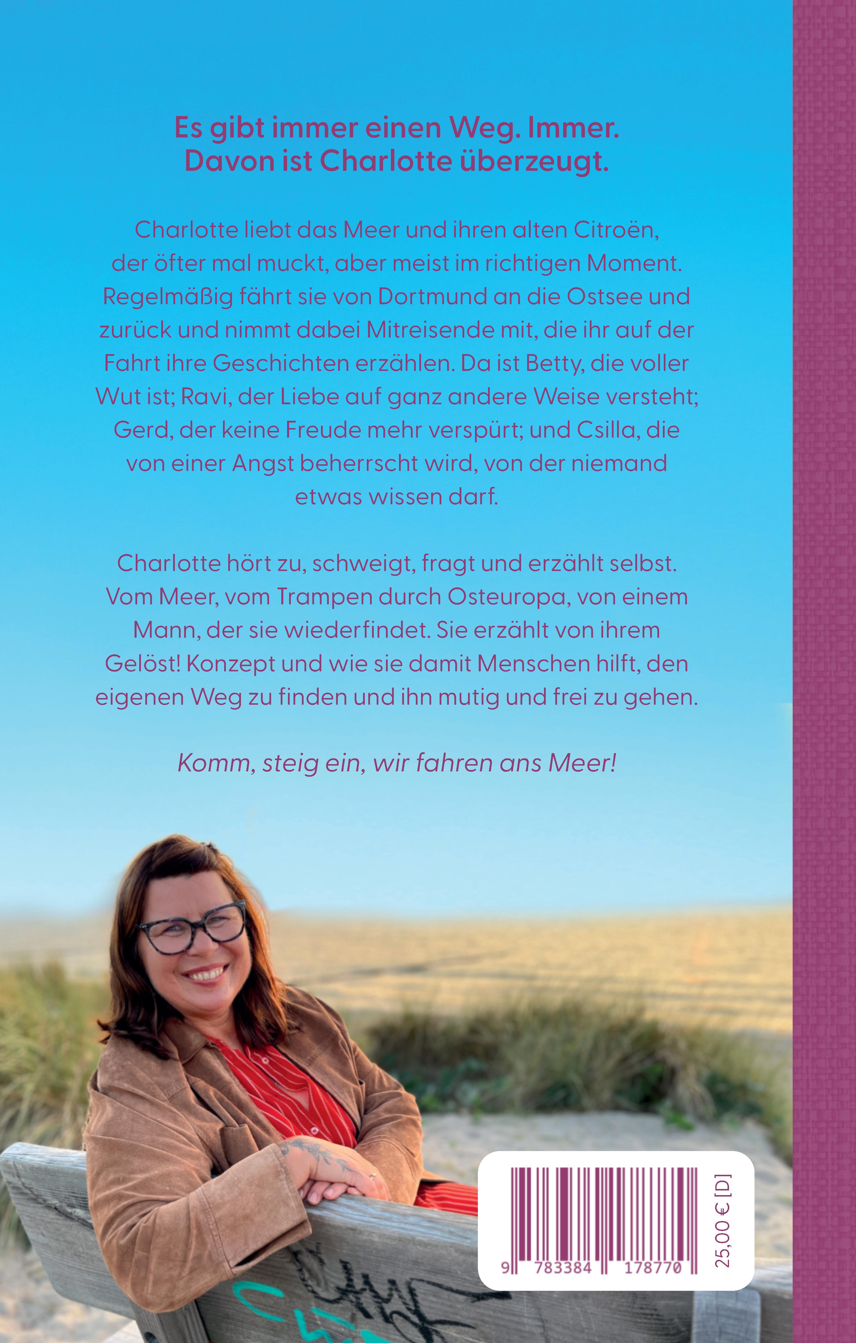 Es gibt immer einen Weg. Immer. Davon ist Charlotte überzeugt.Charlotte liebt das Meer und ihren alten Citroën, der öfter mal muckt, aber meist im richtigen Moment. Regelmäßig fährt sie von Dortmund an die Ostsee und zurück und nimmt dabei Mitreisende mit, die ihr auf der Fahrt ihre Geschichten erzählen. Da ist Betty, die voller Wut ist; Ravi, der Liebe auf ganz andere Weise versteht; Gerd, der keine Freude mehr verspürt; und Csilla, die von einer Angst beherrscht wird, von der niemand etwas wissen darf.Charlotte hört zu, schweigt, fragt und erzählt selbst. Vom Meer, vom Trampen durch Osteuropa, von einem Mann, der sie wiederfindet. Sie erzählt von ihrem Gelöst! Konzept und wie sie damit Menschen hilft, den eigenen Weg zu finden und ihn mutig und frei zu gehen. Komm, steig ein, wir fahren ans Meer!