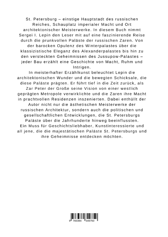 St. Petersburg - einstige Hauptstadt des russischen Reiches, Schauplatz imperialer Macht und Ort architektonischer Meisterwerke. In diesem Buch nimmt Sergei I. Lepin den Leser mit auf eine faszinierende Reise durch die prunkvollen Paläste der russischen Zaren. Von der barocken Opulenz des Winterpalastes über die klassizistische Eleganz des Alexanderpalastes bis hin zu den versteckten Geheimnissen des Jussupow-Palastes - jeder Bau erzählt eine Geschichte von Macht, Ruhm und Intrigen.In meisterhafter Erzählkunst beleuchtet Lepin die architektonischen Wunder und die bewegten Schicksale, die diese Paläste prägten. Er führt tief in die Zeit zurück, als Zar Peter der Große seine Vision von einer westlich geprägten Metropole verwirklichte und die Zaren ihre Macht in prachtvollen Residenzen inszenierten. Dabei enthüllt der Autor nicht nur die ästhetischen Meisterwerke der russischen Architektur, sondern auch die politischen und gesellschaftlichen Entwicklungen, die St. Petersburgs Paläste über die Jahrhunderte hinweg beeinflussten.Ein Muss für Geschichtsliebhaber, Kunstinteressierte und all jene, die die majestätischen Paläste St. Petersburgs und ihre Geheimnisse entdecken möchten.