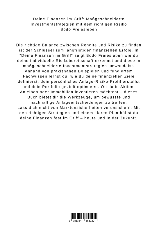 Die richtige Balance zwischen Rendite und Risiko zu finden ist der Schlüssel zum langfristigen finanziellen Erfolg. In "Deine Finanzen im Griff" zeigt Bodo Freiesleben, wie du deine individuelle Risikobereitschaft erkennst und diese in maßgeschneiderte Investmentstrategien umwandelst. Anhand von praxisnahen Beispielen und fundiertem Fachwissen lernst du, wie du deine finanziellen Ziele definierst, dein persönliches Anlage-Risiko-Profil erstellst und dein Portfolio gezielt optimierst. Ob du in Aktien, Anleihen oder Immobilien investieren möchtest - dieses Buch bietet dir die Werkzeuge, um bewusste und nachhaltige Anlageentscheidungen zu treffen. Lass dich nicht von Marktunsicherheiten verunsichern. Mit den richtigen Strategien und einem klaren Plan hältst du deine Finanzen fest im Griff - heute und in der Zukunft.