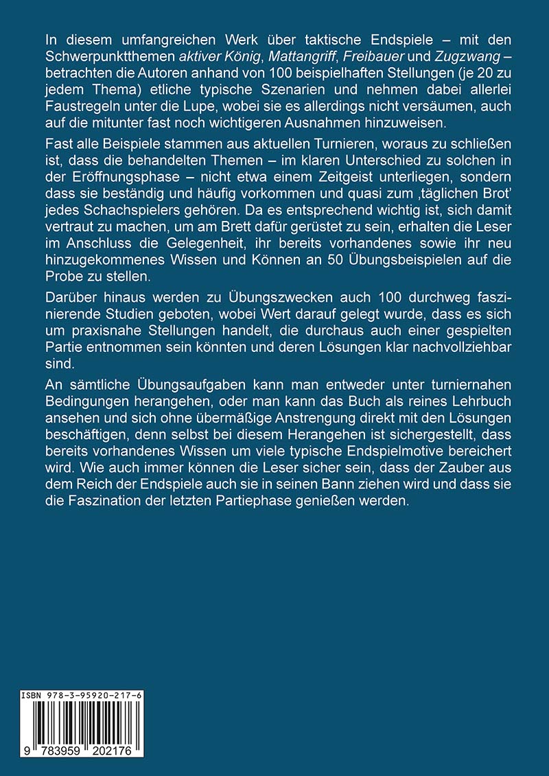 In diesem umfangreichen Werk über taktische Endspiele - mit den Schwerpunktthemen aktiver König, Mattangriff, Freibauer und Zugzwang - betrachten die Autoren anhand von 100 beispielhaften Stellungen (je 20 zu jedem Thema) etliche typische Szenarien und nehmen dabei allerlei Faustregeln unter die Lupe, wobei sie es allerdings nicht versäumen, auch auf die mitunter fast noch wichtigeren Ausnahmen hinzuweisen.Fast alle Beispiele stammen aus aktuellen Turnieren, woraus zu schließen ist, dass die behandelten Themen - im klaren Unterschied zu solchen in der Eröffnungsphase - nicht etwa einem Zeitgeist unterliegen, sondern dass sie beständig und häufig vorkommen und quasi zum 'täglichen Brot' jedes Schachspielers gehören. Da es entsprechend wichtig ist, sich damit vertraut zu machen, um am Brett dafür gerüstet zu sein, erhalten die Leser im Anschluss die Gelegenheit, ihr bereits vorhandenes sowie ihr neu hinzugekommenes Wissen und Können an 50 Übungsbeispielen auf die Probe zu stellen.Darüber hinaus werden zu Übungszwecken auch 100 durchweg faszinierende Studien geboten, wobei Wert darauf gelegt wurde, dass es sich um praxisnahe Stellungen handelt, die durchaus auch einer gespielten Partie entnommen sein könnten und deren Lösungen klar nachvollziehbar sind.An sämtliche Übungsaufgaben kann man entweder unter turniernahen Bedingungen herangehen, oder man kann das Buch als reines Lehrbuch ansehen und sich ohne übermäßige Anstrengung direkt mit den Lösungen beschäftigen, denn selbst bei diesem Herangehen ist sichergestellt, dass bereits vorhandenes Wissen um viele typische Endspielmotive bereichert wird. Wie auch immer können die Leser sicher sein, dass der Zauber aus dem Reich der Endspiele auch sie in seinen Bann ziehen wird und dass sie die Faszination der letzten Partiephase genießen werden.