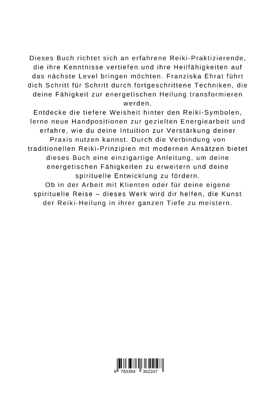 Dieses Buch richtet sich an erfahrene Reiki-Praktizierende, die ihre Kenntnisse vertiefen und ihre Heilfähigkeiten auf das nächste Level bringen möchten. Franziska Ehrat führt dich Schritt für Schritt durch fortgeschrittene Techniken, die deine Fähigkeit zur energetischen Heilung transformieren werden.Entdecke die tiefere Weisheit hinter den Reiki-Symbolen, lerne neue Handpositionen zur gezielten Energiearbeit und erfahre, wie du deine Intuition zur Verstärkung deiner Praxis nutzen kannst. Durch die Verbindung von traditionellen Reiki-Prinzipien mit modernen Ansätzen bietet dieses Buch eine einzigartige Anleitung, um deine energetischen Fähigkeiten zu erweitern und deine spirituelle Entwicklung zu fördern.Ob in der Arbeit mit Klienten oder für deine eigene spirituelle Reise - dieses Werk wird dir helfen, die Kunst der Reiki-Heilung in ihrer ganzen Tiefe zu meistern.