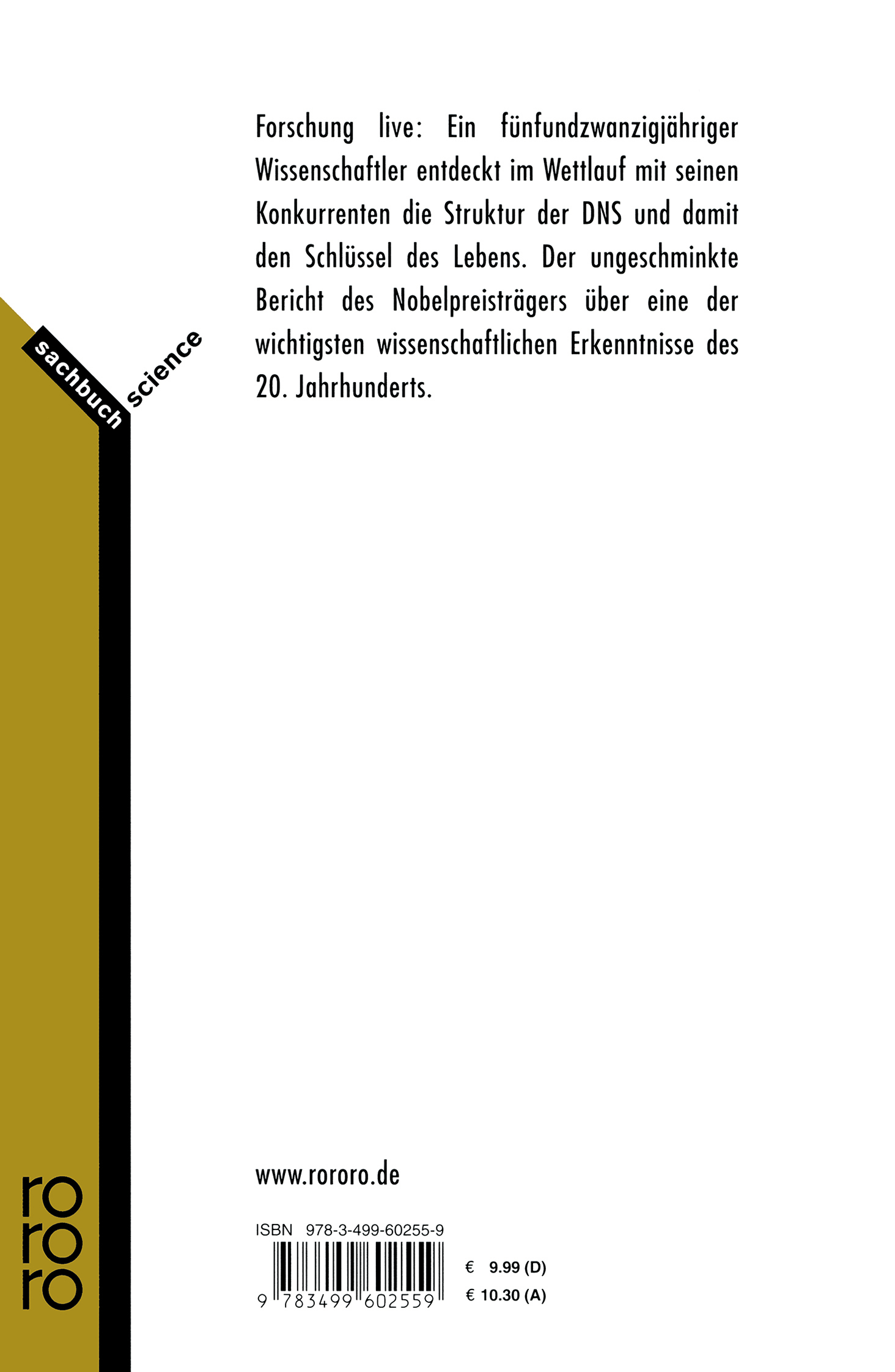 Forschung live: Ein fünfundzwanzigjähriger Wissenschaftler entdeckt im Wettlauf mit seinen Konkurrenten die Struktur der DNS und damit den Schlüssel des Lebens. Der ungeschminkte Bericht des Nobelpreisträgers über eine der wichtigsten wissenschaftlichen Erkenntnisse des 20. Jahrhunderts.