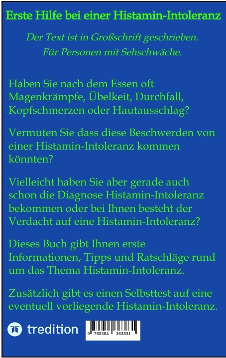 | Schlagworte | Diagnose • einfach erklärt • Ernährungsumstellung • Essen • Gesundheit • Hilfe • Histamin • Histaminintoleranz • Histamin-Intoleranz • Körper • Ratgeber • schnelle Wissensvermittlung • Selbsttest |