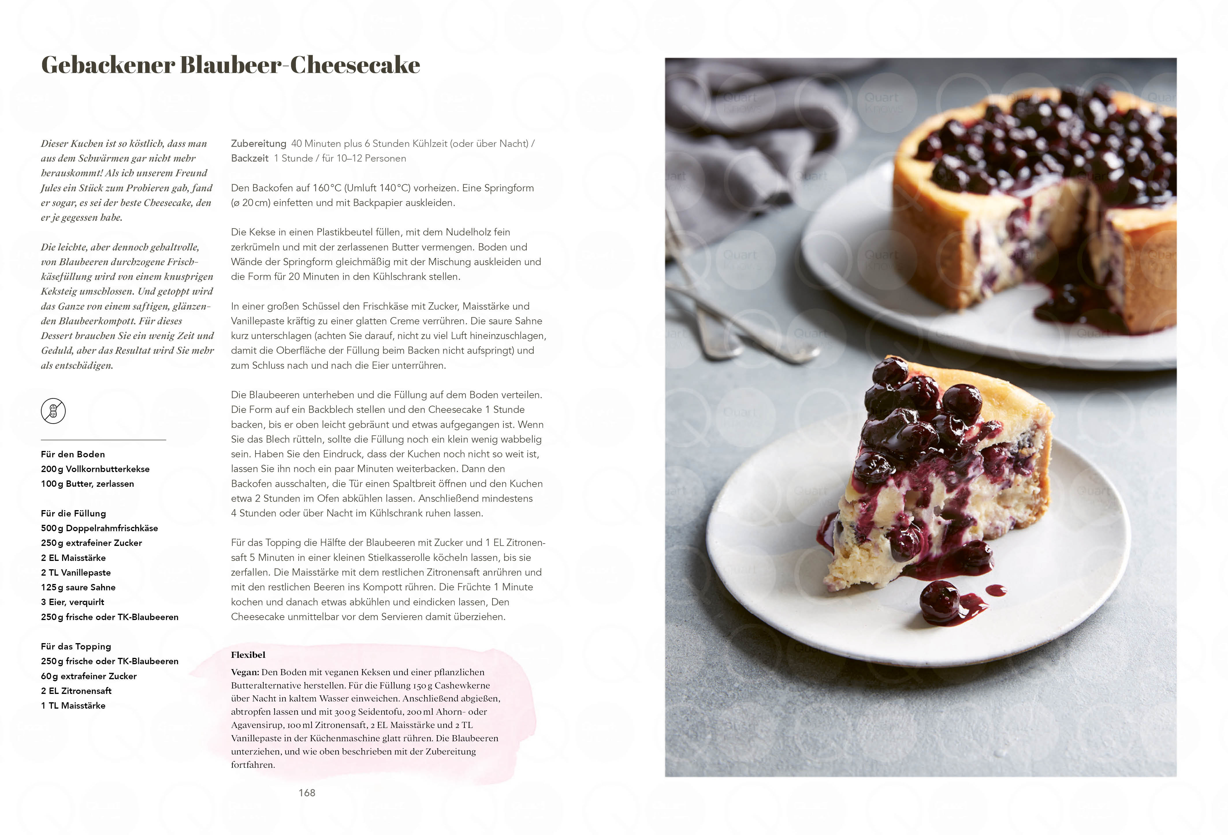 Unterteilt ist das Buch in sechs Kapitel, von herzhaft bis süß. Die Vielfalt der Rezepte reicht vom würzigen Süßkartoffel-Strudel über Zitronen-Oliven-Shortbread bis hin zu gesalzenen Honig-Pistazien-Küchlein und Blaubeer-Käsekuchen.