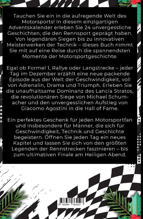 Motorsport Adventskalender - 24 packende Geschichten für RennsportfansDas perfekte Geschenk für Männer, die Geschwindigkeit liebenDieser Motorsport-Adventskalender ist das ultimative Geschenk für alle, die das Adrenalin und die Faszination des Rennsports hautnah erleben möchten. Tauchen Sie ein in 24 packende Geschichten, die die größten Momente der Motorsportgeschichte beleuchten. Ob Formel 1, Rallye oder Langstrecke - jeder Tag bringt eine neue Episode voller Spannung, Technik und Geschichte.Erleben Sie die Siege, Dramen und technologischen Durchbrüche, die den Motorsport geprägt haben, und genießen Sie die perfekte Mischung aus Emotionen, packender Action und Ingenieurskunst. Ideal als Geschenk für Männer, die Geschwindigkeit und Nervenkitzel lieben!Was erwartet Sie in diesem Buch?-24 spannende Motorsportgeschichten: Ein tägliches Abenteuer durch die faszinierendsten Momente des Motorsports, von den Anfängen bis zu den modernen Legenden.-Legendäre Fahrzeuge und Fahrer: Lernen Sie die Geschichten hinter Ikonen wie dem Lancia Stratos, Porsche 917/10, Giacomo Agostini und Michael Schumacher kennen.-Perfekte Mischung aus Technik und Emotion: Jede Geschichte zeigt die Technik und das Herzblut, die hinter den großen Erfolgen der Motorsportgeschichte stehen.-Ein einzigartiger Adventskalender: Jeden Tag im Dezember eine neue Geschichte - ideal, um die Vorfreude auf die Feiertage mit Rennsport-Highlights zu füllen.-Das perfekte Geschenk für Männer: Egal ob zum Geburtstag, zu Weihnachten oder einfach als Überraschung - dieses Buch wird jeden Motorsportfan begeistern.Für wen ist dieses Buch gedacht?-Für Motorsportfans, die mehr über die Geschichte und die größten Momente des Rennsports erfahren möchten.-Für Männer, die sich für Geschwindigkeit, Technik und den Nervenkitzel der Rennstrecken begeistern.-Für alle, die auf der Suche nach einem außergewöhnlichen Geschenk sind, das sowohl unterhaltsam als auch informativ ist.Machen Sie diesen Dezember zu etwas ganz Besonderem mit 24 unvergesslichen Motorsportmomenten!