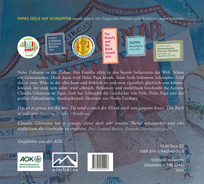 ******MEHR ÜBER UNS UND DEN INDEPENDENT-VERLAG MONTEROSA FINDEN SIE HIER: www.monterosa-verlag.de ODER https://www.startnext.com/monterosa-verlag-20********-----------------------------------------------------------------------------------------------------------------------------------------------------------------------------*****10 JAHRE PAPAS SEELE HAT SCHNUPFEN ****** Jubliäumsausgabe ***** Seit 10 Jahren veranstaltet Claudia Gliemann Lesungen aus "Papas Seele hat Schnupfen" zum Thema "Wenn ein Elternteil unter Depressionen leidet" an Schulen und sozialen Einrichtungen und ist seit 10 Jahren darüber mit Kindern und Erwachsenen im Gespräch, um Eltern und Kindern eine Sprache und Gesprächsanlässe zu geben, um über unsichtbare Krankheiten zu sprechen und Kindern und Eltern zu zeigen, dass psychische Erkrankungen genauso Erkrankungen sind wie Erkrankungen des Körpers, dass man sie vielleicht ein klein wenig besser verstehen kann, wenn sie gut erklärt werden und man dafür Bilder hat. Und dass Gefühle wichtig sind. --------------------------------- Umfangreiche Weiterentwicklungen und Ergänzungen erhältlich: 1.) Version für Kinder ab 4 Jahren: "Papas Seele hat Schnupfen - Papas bunte Brücke". 2.) BAND 2: Lesebuch mit 23 Kapiteln. Thema: Psychiatrieaufenthalt eines Elternteils: "Papas Seele hat Schnupfen - Ein Muffin für Nele". 3.) Malbuch: "Papas Seele hat Schnupfen - so geht es mir", 4.) CD mit Liedern zum Buch: "Papas Seele hat Schnupfen - eine musikalische Reise", 5.) Schulkonzept: "Papas Seele hat Schnupfen - Unterrichtsimpulse". Mehr unter: https://www.monterosa-verlag.de/papas-seele/----------------------------------------------------------------------------------------------------------------------------------------------------------------Das Buch mit der Originalausgabe mit der ISBN-Nr. 978-3-942640-06-0 wurde: 3-FACH PREISGEKRÖNT und 4-FACH NOMINIERT mit folgenden Preisen/Auszeichnungen:--------------------------------------------------------------------------------------------------------------------------------------------------------------------------1.) "DGPPN-Antistigma-Preis" 2015 - Förderpreis zur Entstigmatisierung psychischer Erkrankungen (Deutsche Gesellschaft für Psychiatrie und Psychotherapie, Psychosomatik und Nervenheilkunde) ***** 2.) "The Beauty and The Book Award" 2015 (Publikumspreis, verliehen von der Frankfurter Buchmesse und der Stiftung Buchkunst) ***** 3.) Longlist "Schönste deutsche Bücher" 2015 (Stiftung Buchkunst) ****** 4.) "Nachwuchspreis für deutschsprachige Kinder- und Jugendliteratur" 2015 (Deutsche Akademie für Kinder- und Jugendliteratur e.V.) ***** 5.) "Kinderbuch des Monats" April 2015 (Deutsche Akademie für Kinder- und Jugendliteratur e.V.) ***** 6.) Nominee GERMAN DESIGN AWARD 2017, 7.) KIMI-Siegel 2020---------------------------------------------------------------------------------------------------------------------------------------------------------------------------Seit 10 Jahren darf "Papas Seele hat Schnupfen" Kinder, Eltern und Fachpersonen unterstützen, wenn ein Elternteil unter Depressionen erkrankt ist. Das Jubiläum und die Freude darüber haben wir zum Anlass genommen, das Buch um einige Inhalte zu ergänzen. Seit Erscheinen des Buches im Jahr 2014 liest Claudia Gliemann, die Autorin des Buches, aus ihrem Buch und verbindet Text und Bild mit Musik zu musikalischen Lesungen. Sie ist zu Gast bei Schulen, Kliniken und sozialen Einrichtungen, auf dem DGPPN-Kongress in Berlin, bei großen Fachtagen genauso wie in Projekten für Kinder psychisch erkrankter Eltern. Die Erfahrungen aus diesen Lesereisen sowie auch Texte von Personen, die sich im Bereich "Kinder psychisch erkrankter Eltern" engagieren bzw. die selbst Erfahrungen mit der Erkrankung als Kinder, Eltern oder Angehörige gemacht haben, finden sich in dieser Jubiläumsausgabe, und zwar unter anderem diese: ---------------------------------------------------------------------------------------------------
