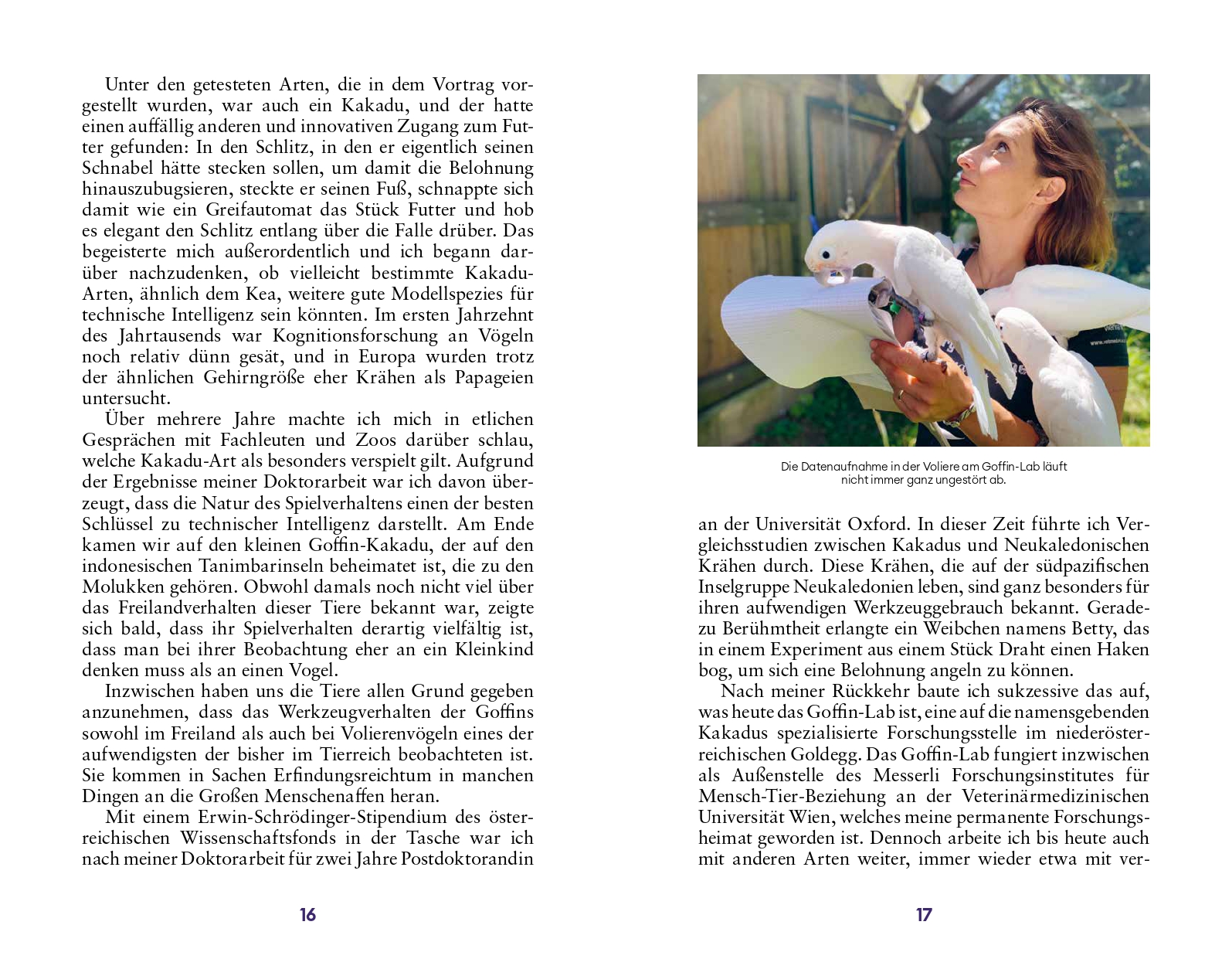Die Kognitionsbiologin Alice Auersperg ist Gründerin und Leiterin des Goffin-Labs am Messerli Forschungsinstitut der Veterinärmedizinischen Universität Wien.Sie forscht zu tierischer Intelligenz an Forschungsstätten und Zoos sowie im Freiland, aktuell vor allem mit Papageienvögeln, aber auch interdisziplinär mit Affen, Kindern und Robotern. Zuvor arbeitete sie u.a. an der Universität Edinburgh, der Universität Wien und an der Universität Oxford. Sie ist Mitglied der Jungen Akademie der ÖAW.