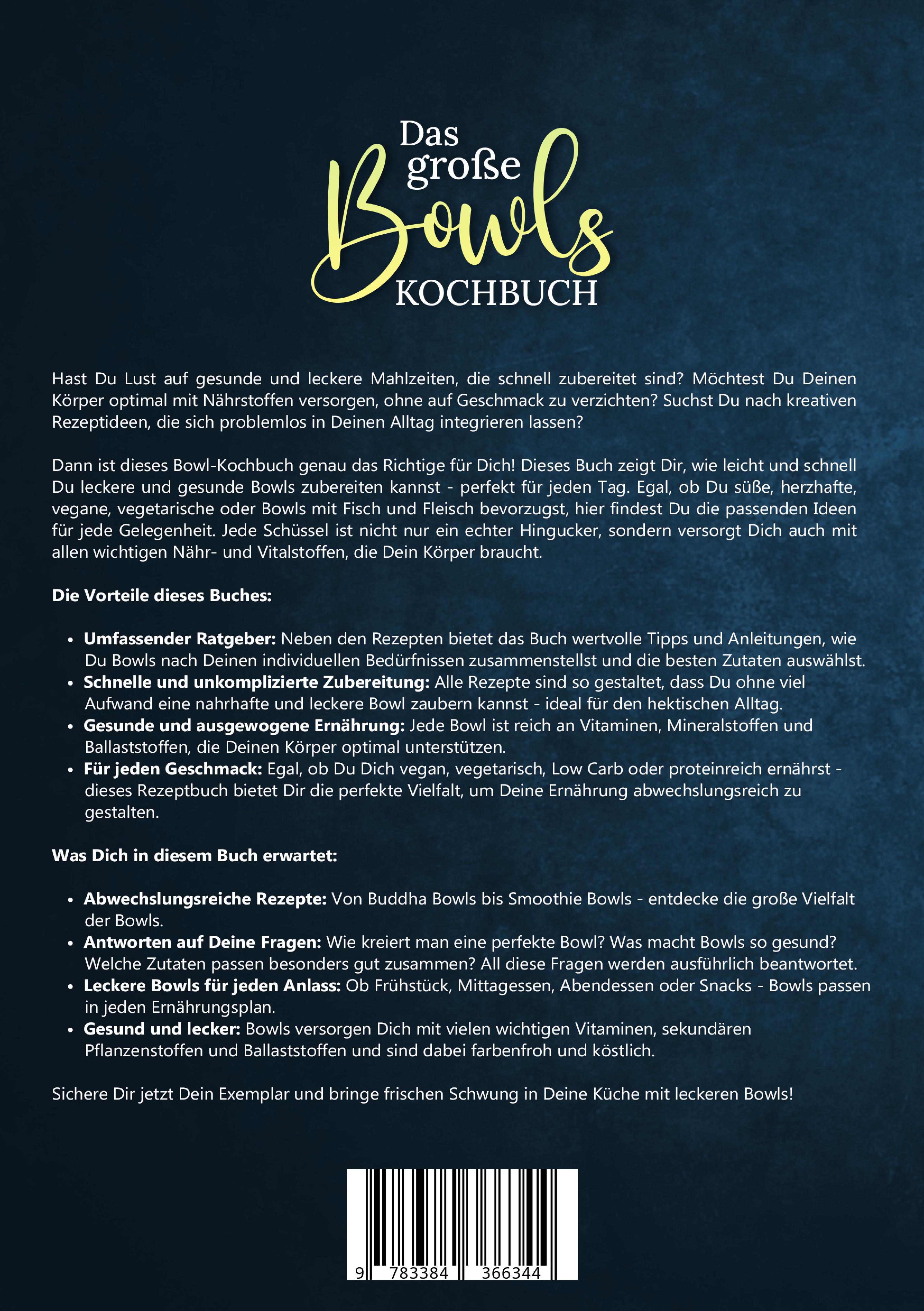 Hast Du Lust auf gesunde und leckere Mahlzeiten, die schnell zubereitet sind? Möchtest Du Deinen Körper optimal mit Nährstoffen versorgen, ohne auf Geschmack zu verzichten? Suchst Du nach kreativen Rezeptideen, die sich problemlos in Deinen Alltag integrieren lassen?Dann ist dieses Bowl-Kochbuch genau das Richtige für Dich! Dieses Buch zeigt Dir, wie leicht und schnell Du leckere und gesunde Bowls zubereiten kannst - perfekt für jeden Tag. Egal, ob Du süße, herzhafte, vegane, vegetarische oder Bowls mit Fisch und Fleisch bevorzugst, hier findest Du die passenden Ideen für jede Gelegenheit. Jede Schüssel ist nicht nur ein echter Hingucker, sondern versorgt Dich auch mit allen wichtigen Nähr- und Vitalstoffen, die Dein Körper braucht.Die Vorteile dieses Buches:- Umfassender Ratgeber: Neben den Rezepten bietet das Buch wertvolle Tipps und Anleitungen, wie Du Bowls nach Deinen individuellen Bedürfnissen zusammenstellst und die besten Zutaten auswählst.- Schnelle und unkomplizierte Zubereitung: Alle Rezepte sind so gestaltet, dass Du ohne viel Aufwand eine nahrhafte und leckere Bowl zaubern kannst - ideal für den hektischen Alltag.- Gesunde und ausgewogene Ernährung: Jede Bowl ist reich an Vitaminen, Mineralstoffen und Ballaststoffen, die Deinen Körper optimal unterstützen.- Für jeden Geschmack: Egal, ob Du Dich vegan, vegetarisch, Low Carb oder proteinreich ernährst - dieses Rezeptbuch bietet Dir die perfekte Vielfalt, um Deine Ernährung abwechslungsreich zu gestalten.Was Dich in diesem Buch erwartet:- Abwechslungsreiche Rezepte: Von Buddha Bowls bis Smoothie Bowls - entdecke die große Vielfalt der Bowls.- Antworten auf Deine Fragen: Wie kreiert man eine perfekte Bowl? Was macht Bowls so gesund? Welche Zutaten passen besonders gut zusammen? All diese Fragen werden ausführlich beantwortet.- Leckere Bowls für jeden Anlass: Ob Frühstück, Mittagessen, Abendessen oder Snacks - Bowls passen in jeden Ernährungsplan.- Gesund und lecker: Bowls versorgen Dich mit vielen wichtigen Vitaminen, sekundären Pflanzenstoffen und Ballaststoffen und sind dabei farbenfroh und köstlich.Sichere Dir jetzt Dein Exemplar und bringe frischen Schwung in Deine Küche mit leckeren Bowls!