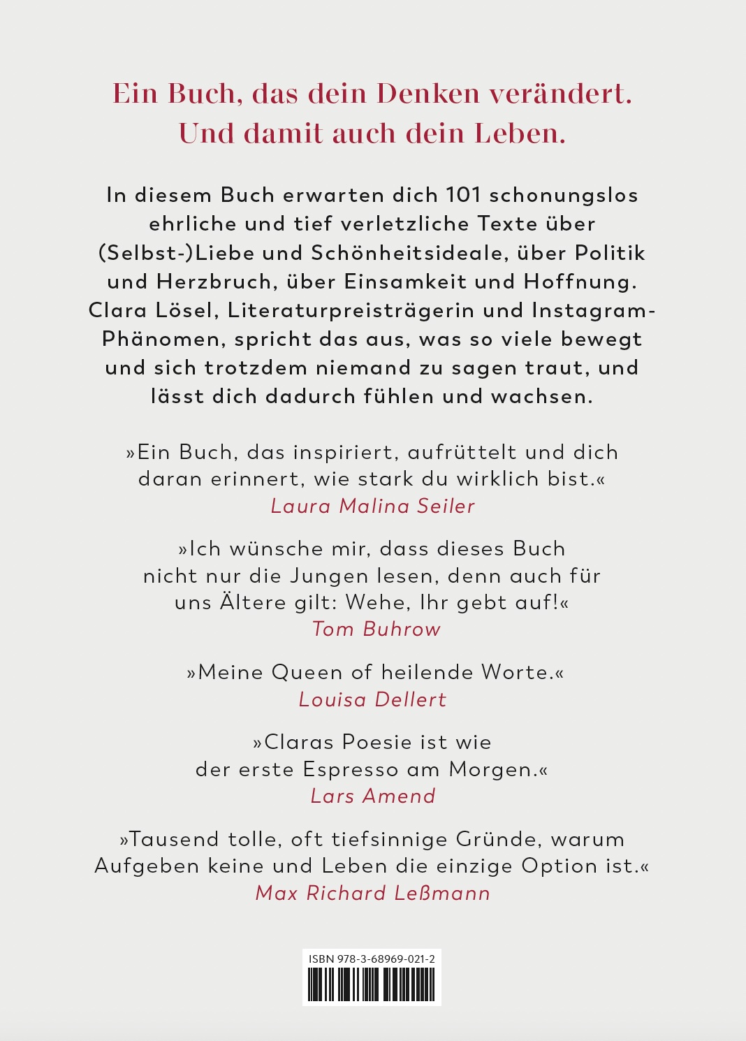 In diesem Buch erwarten dich 101 schonungslos ehrliche und tief verletzliche Texte über (Selbst-)Liebe und Schönheitsideale, über Politik und Herzbruch, über Einsamkeit und Hoffnung. Clara Lösel, Literaturpreisträgerin und Instagramphänomen, spricht das aus, was so viele bewegt und sich trotzdem niemand zu sagen traut, und lässt dich dadurch fühlen und wachsen.