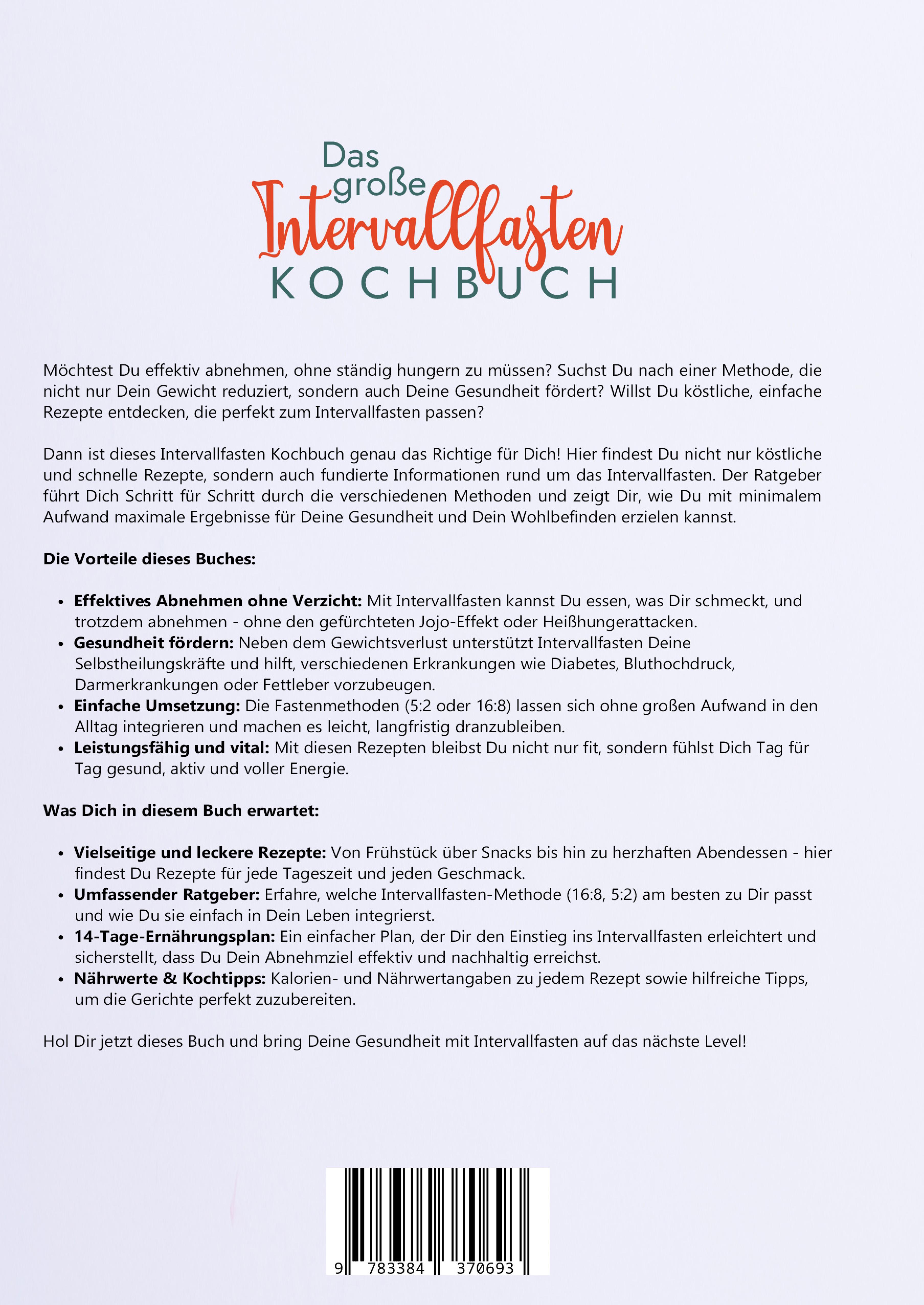 Möchtest Du effektiv abnehmen, ohne ständig hungern zu müssen? Suchst Du nach einer Methode, die nicht nur Dein Gewicht reduziert, sondern auch Deine Gesundheit fördert? Willst Du köstliche, einfache Rezepte entdecken, die perfekt zum Intervallfasten passen?Dann ist dieses Intervallfasten Kochbuch genau das Richtige für Dich! Hier findest Du nicht nur köstliche und schnelle Rezepte, sondern auch fundierte Informationen rund um das Intervallfasten. Der Ratgeber führt Dich Schritt für Schritt durch die verschiedenen Methoden und zeigt Dir, wie Du mit minimalem Aufwand maximale Ergebnisse für Deine Gesundheit und Dein Wohlbefinden erzielen kannst.Die Vorteile dieses Buches:- Effektives Abnehmen ohne Verzicht: Mit Intervallfasten kannst Du essen, was Dir schmeckt, und trotzdem abnehmen - ohne den gefürchteten Jojo-Effekt oder Heißhungerattacken.- Gesundheit fördern: Neben dem Gewichtsverlust unterstützt Intervallfasten Deine Selbstheilungskräfte und hilft, verschiedenen Erkrankungen wie Diabetes, Bluthochdruck, Darmerkrankungen oder Fettleber vorzubeugen.- Einfache Umsetzung: Die Fastenmethoden (5:2 oder 16:8) lassen sich ohne großen Aufwand in den Alltag integrieren und machen es leicht, langfristig dranzubleiben.- Leistungsfähig und vital: Mit diesen Rezepten bleibst Du nicht nur fit, sondern fühlst Dich Tag für Tag gesund, aktiv und voller Energie.Was Dich in diesem Buch erwartet:- Vielseitige und leckere Rezepte: Von Frühstück über Snacks bis hin zu herzhaften Abendessen - hier findest Du Rezepte für jede Tageszeit und jeden Geschmack.- Umfassender Ratgeber: Erfahre, welche Intervallfasten-Methode (16:8, 5:2) am besten zu Dir passt und wie Du sie einfach in Dein Leben integrierst.- 14-Tage-Ernährungsplan: Ein einfacher Plan, der Dir den Einstieg ins Intervallfasten erleichtert und sicherstellt, dass Du Dein Abnehmziel effektiv und nachhaltig erreichst.- Nährwerte & Kochtipps: Kalorien- und Nährwertangaben zu jedem Rezept sowie hilfreiche Tipps, um die Gerichte perfekt zuzubereiten.Hol Dir jetzt dieses Buch und bring Deine Gesundheit mit Intervallfasten auf das nächste Level!