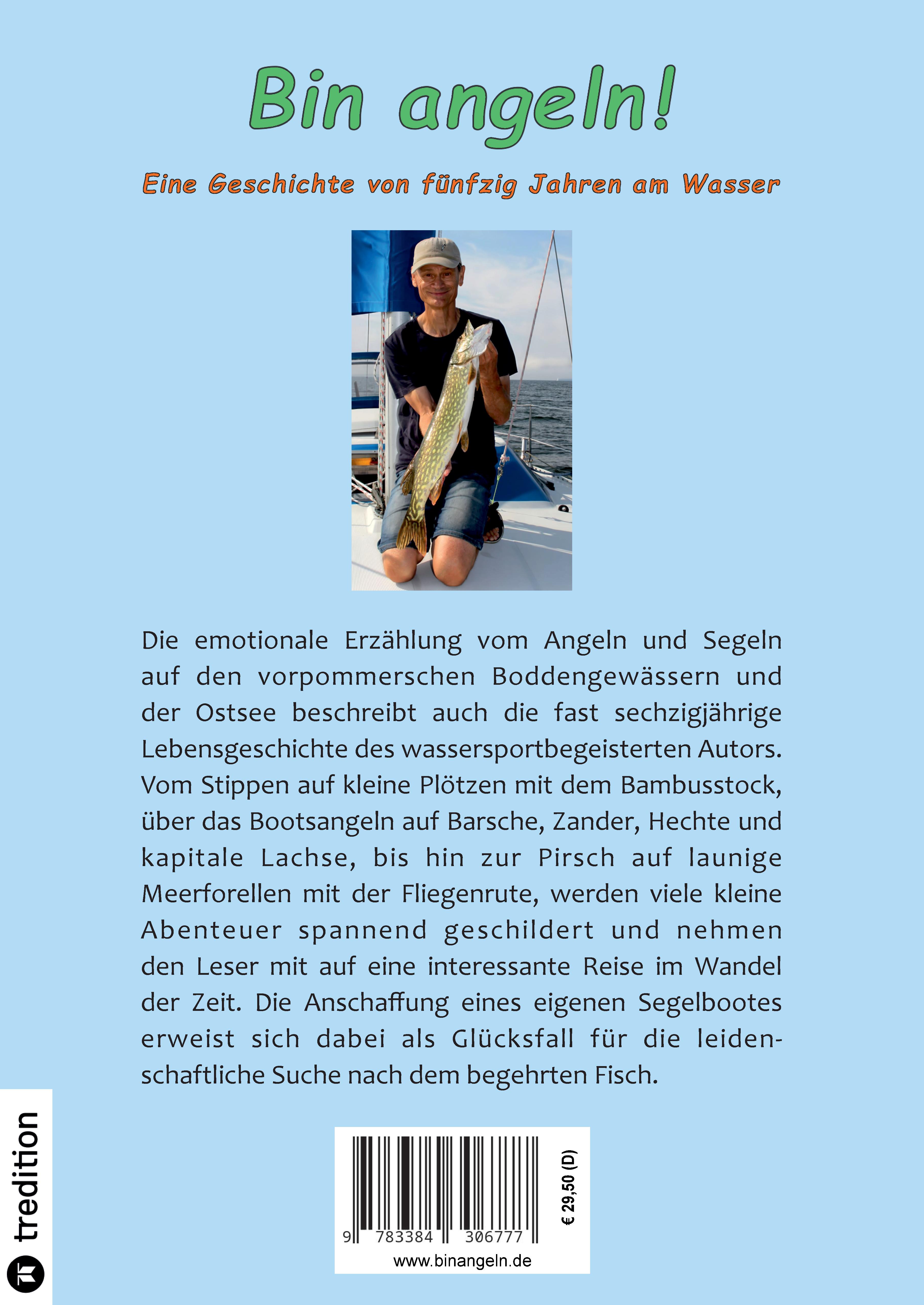 Heiko Boersch, born in Rostock in 1964, started fishing as a boy at the age of nine. He graduated from high school and studied electronics at Rostock University. Immediately after the end of the GDR, he had the opportunity to become self-employed and he successfully founded an IT company as a co-owner. Fishing has always been his great passion alongside his job and since 1990 he has also used a sailing boat on the Bodden waters of Western Pomerania and the Baltic Sea. He met his wife during a serious illness and since then they have been travelling together with and without a boat. Fishing with a rod is still his focus and today his grandchildren also like to come to the water with him. Interesting stories, especially about fishing and sailing, fascinated him from an early age. Over thirty years ago he won a competition with a fishing story and travelled to Holland for a weekend to visit the well-known fishing book author Jan Eggers. Over the years he wrote several reports about his travels on a sailing boat, but these were not published. Excerpts from Ulrich Basan's diaries, which appeared in the GDR fishing newspaper at the end of the 1980s, gave him the inspiration to turn his stories into a book. He particularly liked Basan's casual and humorous writing style, with nonchalance as Basan himself says, and this can also be found in "Bin angeln!"