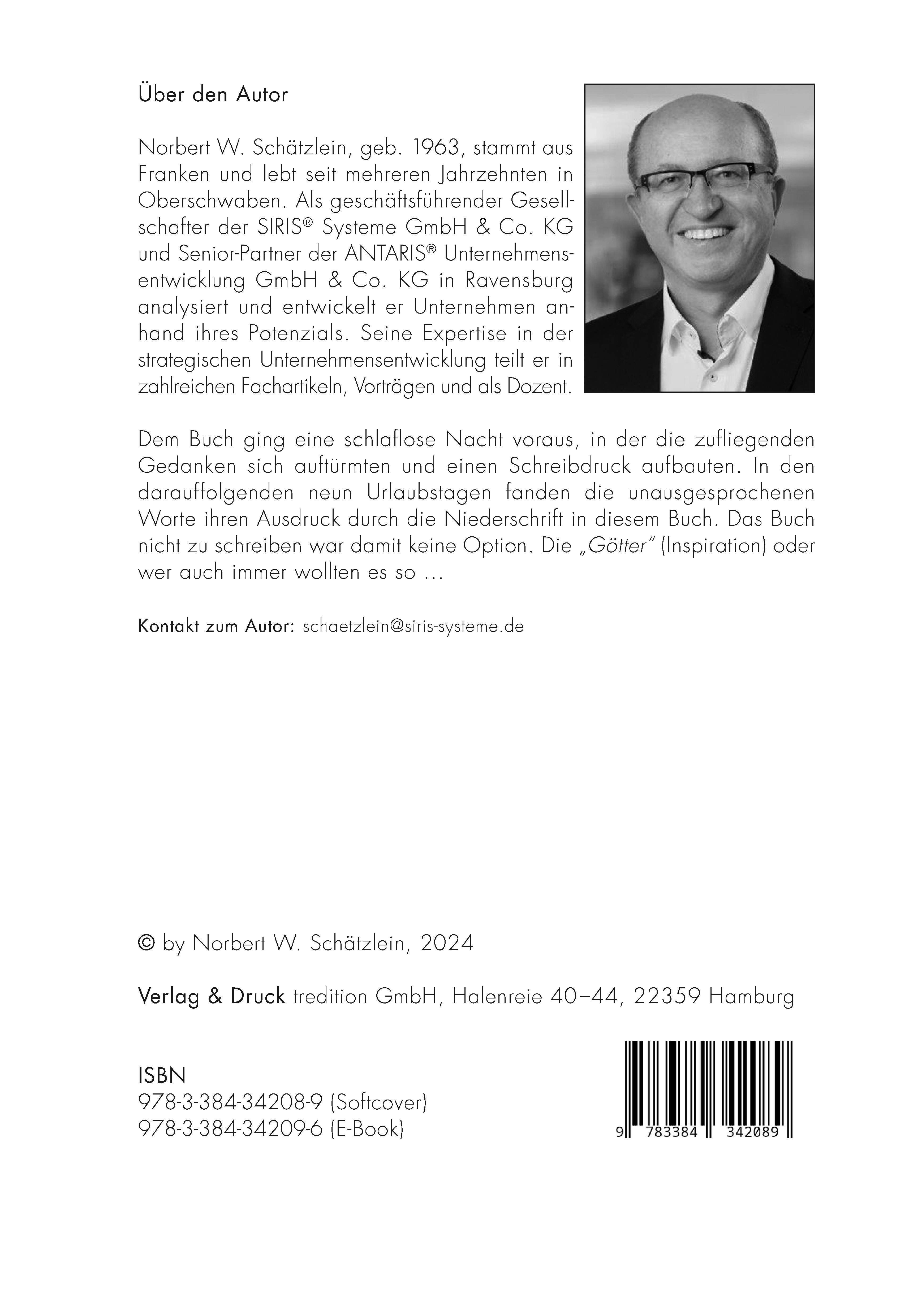 Norbert W. Schätzlein, geb. 1963, stammt aus Franken und lebt seit mehreren Jahrzehnten in Oberschwaben. Als geschäftsführender Gesellschafter der SIRIS® Systeme GmbH & Co. KG und Senior-Partner der ANTARIS Unternehmensentwicklung GmbH & Co. KG in Ravensburg analysiert und entwickelt er Unternehmen anhand ihres Potenzials. Seine Expertise in der strategischen Unternehmensentwicklung teilt er in zahlreichen Fachartikeln, Vorträgen und als Dozent.