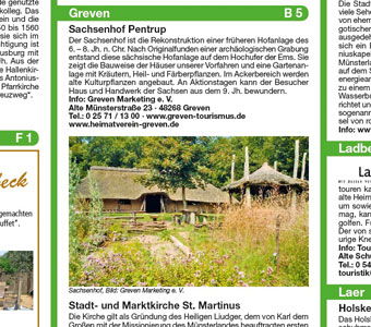 Im Münsterland herrschen für Radler "paradiesische Zustände": Die flache, abwechslungsreiche Parklandschaft ist mit einem 4.500 km umfassenden Radwegenetz durchzogen, das perfekt ausgeschildert ist und sich sowohl für Tagestouren als auch längere Radurlaube eignet. Die Radwege durchlaufen die Parklandschaft des Münsterlandes und passieren das Landgestüt, Schlösser, Kirchen und malerische Ortschaften. 17 Fernradwege werden auf der Rückseite der Radwanderkarte Münsterland vorgestellt, ebenso Infos zu Orten und Sehenswürdigkeiten der Region.