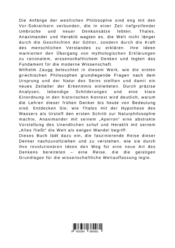 Die Anfänge der westlichen Philosophie sind eng mit den Vor-Sokratikern verbunden, die in einer Zeit tiefgreifender Umbrüche und neuer Denkansätze lebten. Thales, Anaximander und Heraklit wagten es, die Welt nicht länger durch die Geschichten der Götter, sondern durch die Kraft des menschlichen Verstandes zu erklären. Ihre Ideen markierten den Übergang von mythologischen Erklärungen zu rationalem, wissenschaftlichem Denken und legten das Fundament für die moderne Wissenschaft.Wilhelm Zaugg beleuchtet in diesem Werk, wie die ersten griechischen Philosophen grundlegende Fragen nach dem Ursprung und der Natur des Seins stellten und damit ein neues Zeitalter der Erkenntnis einleiteten. Durch präzise Analysen, lebendige Schilderungen und eine klare Einordnung in den historischen Kontext wird deutlich, warum die Lehren dieser frühen Denker bis heute von Bedeutung sind. Entdecken Sie, wie Thales mit der Hypothese des Wassers als Urstoff den ersten Schritt zur Naturphilosophie machte, Anaximander mit seinem "Apeiron" eine abstrakte Vorstellung des Unendlichen schuf und Heraklit mit seinem "Alles fließt" die Welt als ewigen Wandel begriff.Dieses Buch lädt dazu ein, die faszinierende Reise dieser Denker nachzuvollziehen und zu verstehen, wie sie durch ihre revolutionären Ideen den Weg für eine neue Art des Denkens bereiteten - eine Reise, die die geistigen Grundlagen für die wissenschaftliche Weltauffassung legte.