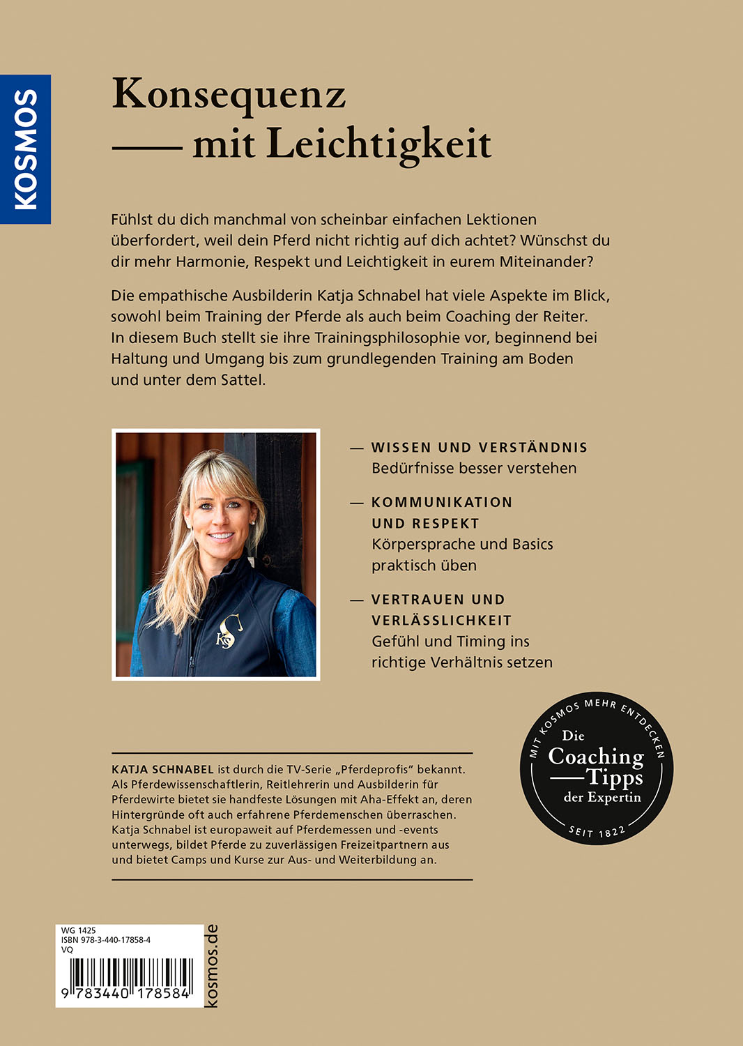 Empathisch, fair, konsequent – so lässt sich Katja Schnabels Trainingsmethode beschreiben. Ihr Umgang mit dem Pferd umfasst jedoch nicht nur das Reiten, sondern ebenso die Haltung, Pflege, Beschäftigung und das Training am Boden und unter dem Sattel. In diesem Buch stellt sie erstmals ihre gesamte Trainingsphilosophie mit vielen praktischen Übungen vor.