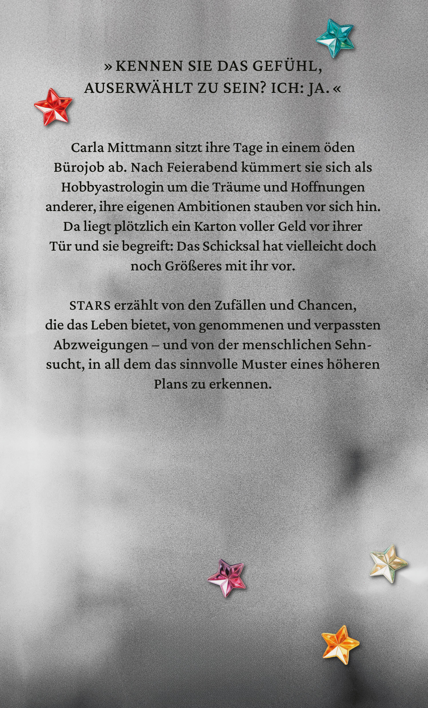 Carla Mittmann, einst hoffnungsfrohe Philosophiestudentin, hat ihr Leben in der Serviceabteilung einer Möbelfirma geparkt. Nebenher betreibt sie eine Horoskop-Website – aus Spaß, als Zuverdienst, Schicksalsglauben liegt ihr fern. Doch dann steht ein Schuhkarton vor ihrer Tür, darin zehntausend Dollar, Absender unbekannt. Sie ergreift die Chance, setzt alles auf eine Karte, steigt in großem Stil ins Astrobusiness ein – und da ist er endlich, der Erfolg. Schnell wird sie zur gefragten Starastrologin und bewegt sich in höchsten gesellschaftlichen Sphären, bis sie sich plötzlich nicht mehr sicher ist: Lenkt sie die Sterne oder lenken die Sterne sie? Ein brillanter, scharfsinniger Roman über die Lust der Verführung und die Sehnsucht nach kosmischer Ordnung in Zeiten der Krise.
