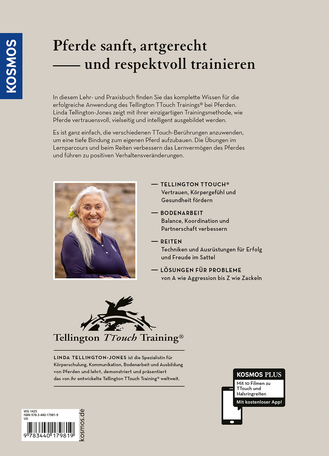 Das umfassende Lehr- und Praxisbuch der berühmten Pferdetrainerin Linda Tellington-Jones enthält das komplette Wissen, um Pferde partnerschaftlich und erfolgreich zu trainieren. Mit ihrer einzigartigen Ausbildungs- und Therapieform gelingt es zuverlässig, Widersetzlichkeiten zu überwinden, die Lernfähigkeit zu steigern und die Bindung zwischen Mensch und Pferd zu stärken. TTouches, Bodenarbeit- und Reitmethoden werden Schritt für Schritt erklärt und anhand Fotos gezeigt. Das Plus zum Buch: die kostenlose KOSMOS-PLUS-App mit 10 Erklär-Filmen.