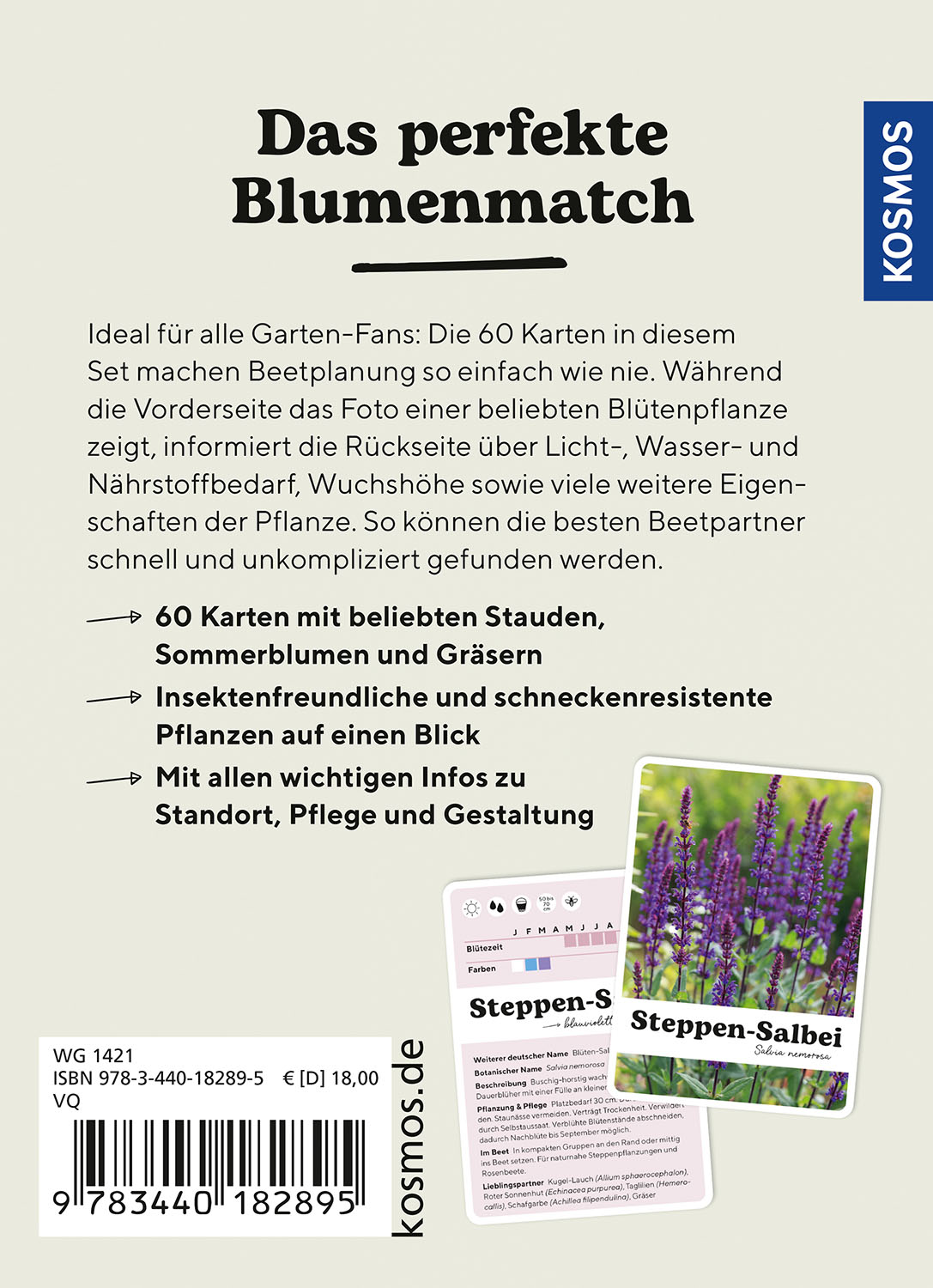 Die 60 handlichen und stabilen Karten in diesem Set zeigen auf ihrer Vorderseite eine beliebte Blütenpflanze und informieren auf der Rückseite über Licht-, Wasser- und Nährstoffbedarf, Wuchshöhe sowie Pflanzpartner. So einfach war Beetplanung noch nie!