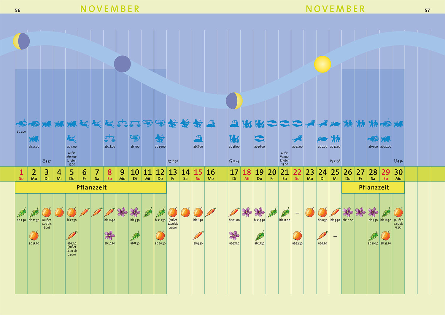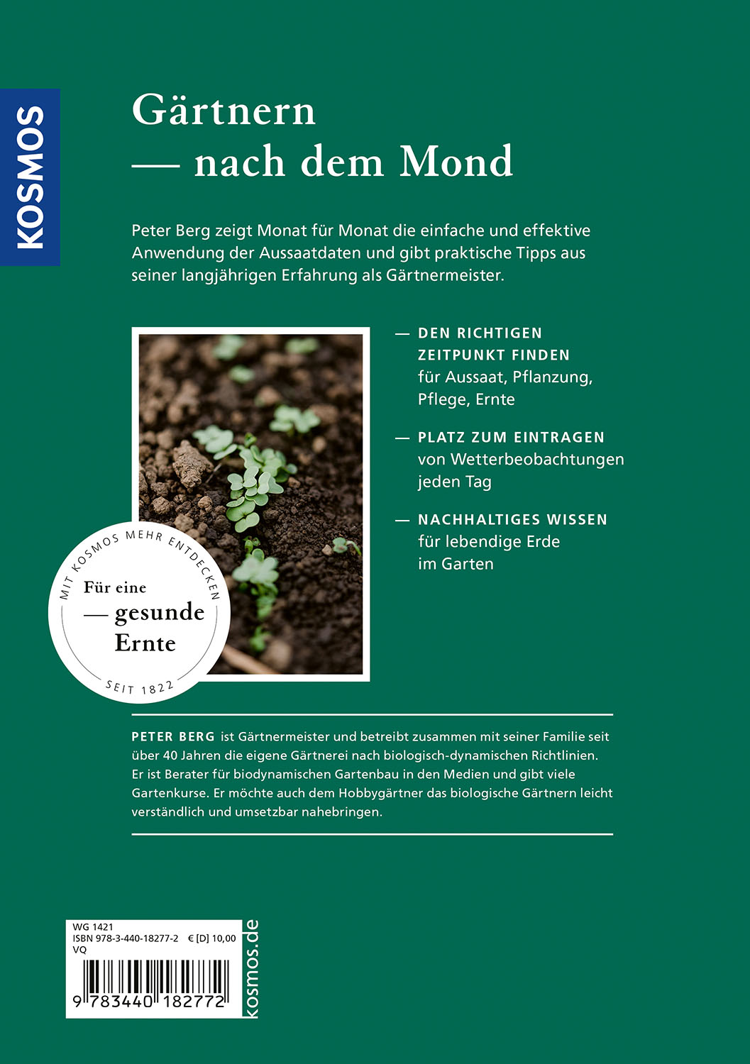 Ökologisch gärtnern nach dem Mond: Aussaattage zum Säen, Pflanzen, Ernten. Gärtnermeister Peter Berg erklärt kurz und kompakt die wichtigsten Grundlagen des biologischen Anbaus nach dem Mondkalender und zeigt, welche Gartenarbeiten jeweils zur Pflanzzeit und Nicht-Pflanzzeit durchgeführt werden sollten. Daneben können im Kalendarium Wetteraufzeichnungen zu Niederschlag, Temperatur und Sonnenstand eingetragen und eigene Beobachten notiert werden. Sonderthema 2026: fruchtbarer Boden.