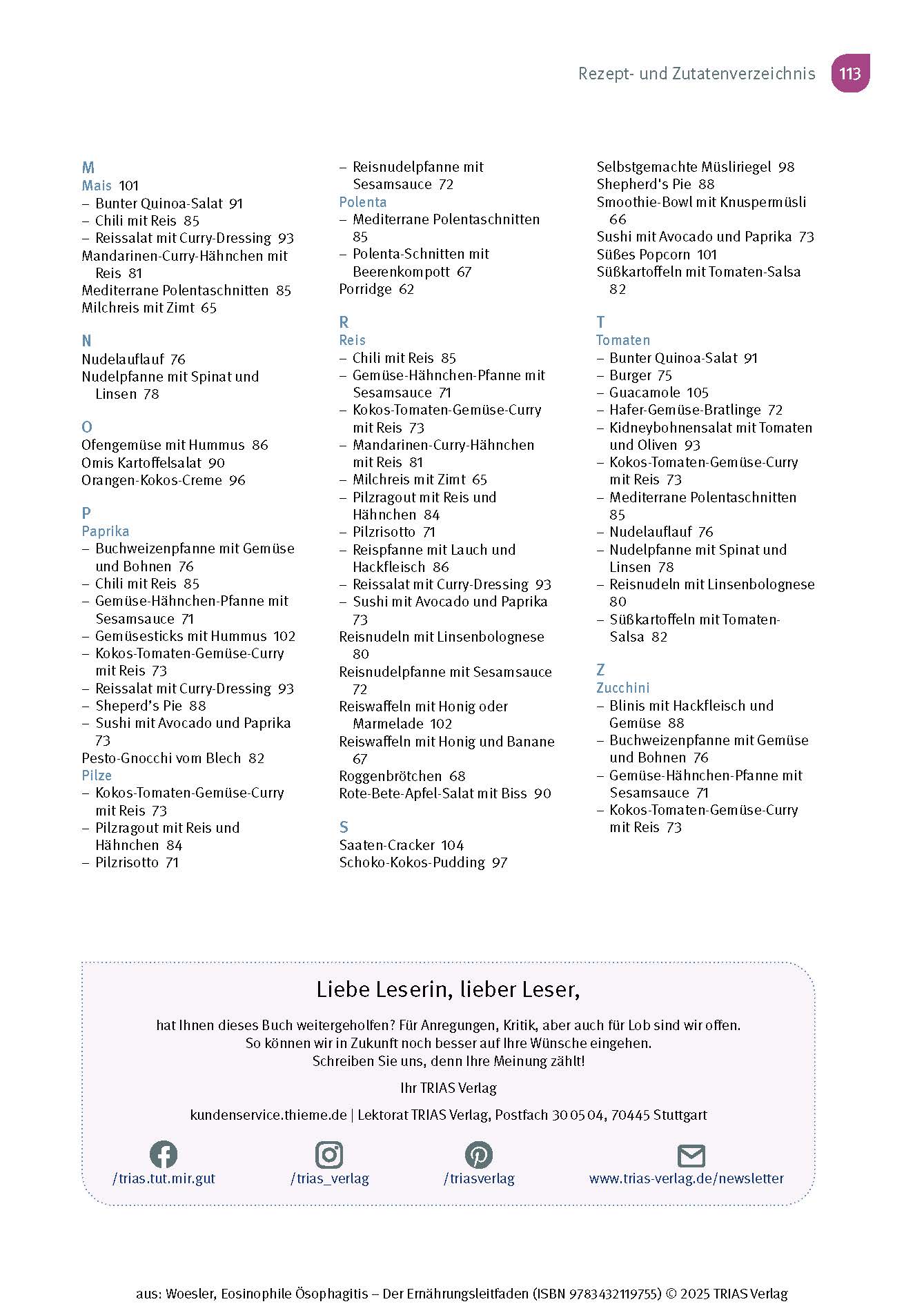 Sodbrennen, Schluckbeschwerden, Schmerzen hinter dem Brustbein, Steckenbleiber, Übelkeit und Erbrechen: Solche Symptome können auf eine EoE hinweisen, denn bei dieser immunvermittelten Erkrankung ist die Speiseröhre durch eine Entzündung beeinträchtigt. Steht die Diagnose nach einer Endoskopie fest, gilt es, die passende Therapie zu wählen. In diesem Ratgeber geht es um die Ernährungstherapie mittels der 2-, 4-, oder 6-Food-Eliminationsdiät. Hier finden Sie eine konkrete Anleitung und Rezepte für die Vorbereitung und Durchführung der Diätphase sowie für die anschließende Wiedereinführung von Lebensmitteln. So können individuelle Trigger identifiziert und Medikamente reduziert werden, wenn die Ernährungstherapie anschlägt.