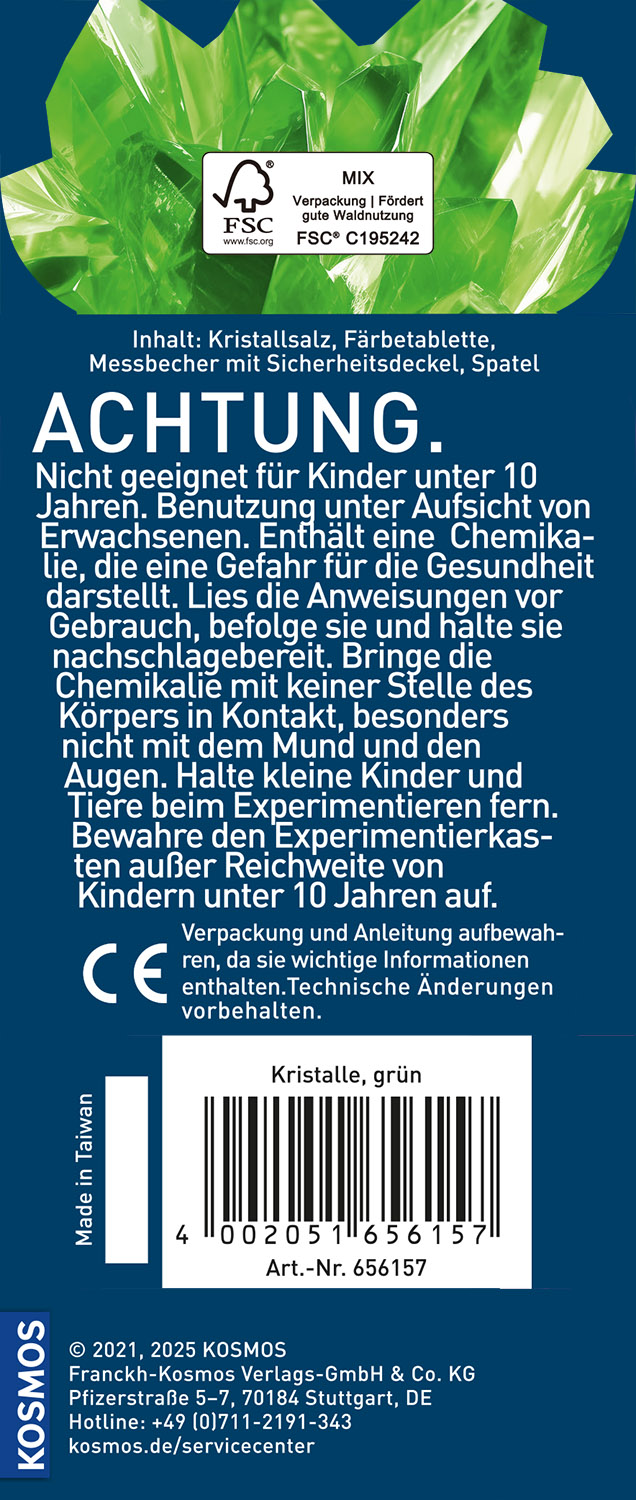 Einfach öffnen und loslegen! Dank des cleveren Designs und der mitgelieferten Materialien lassen sich innerhalb von kurzer Zeit die blauen Kristalle dieses KOSMOS Sets wie von Zauberhand direkt im Verpackungsbecher züchten. Die grünen Kristalle sorgen für funkelnden Spaß und die Kinder sammeln ganz easy erste Erfahrungen in der Welt der Chemie.