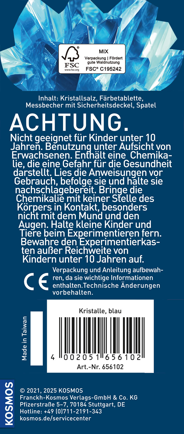 Einfach öffnen und loslegen! Dank des cleveren Designs und der mitgelieferten Materialien lassen sich innerhalb von kurzer Zeit die blauen Kristalle dieses KOSMOS Sets wie von Zauberhand direkt im Verpackungsbecher züchten. Die grünen Kristalle sorgen für funkelnden Spaß und die Kinder sammeln ganz easy erste Erfahrungen in der Welt der Chemie.