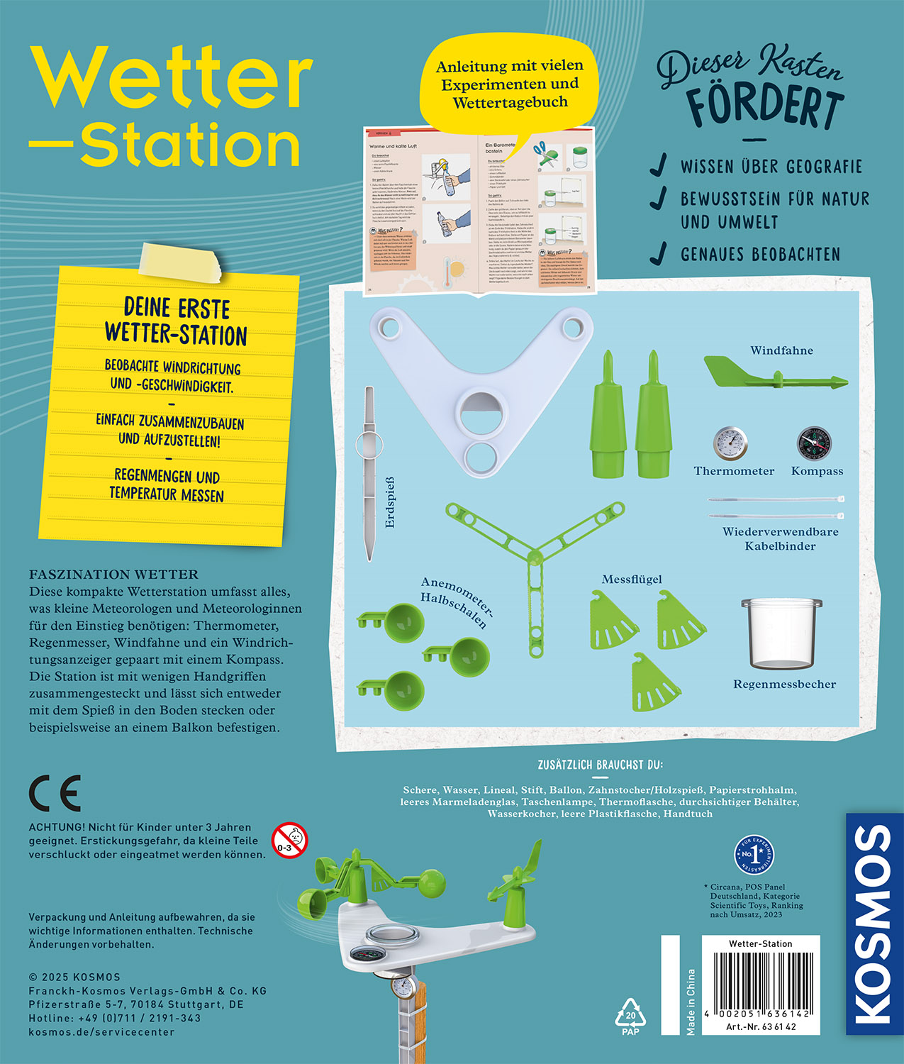 Diese robuste Wetterstation ist ein ideales Geschenk für alle Kinder ab sieben Jahren! Einfach zusammenstecken, draußen platzieren und schon kann dank Windmessern, Kompass, Regenauffangbehälter und Thermometer das Wetter beobachtet und aufgezeichnet werden. Die leicht verständliche Anleitung führt nicht nur Schritt für Schritt durch den Aufbau und stellt spannende Wetterexperimente vor, sie bietet zusätzlich spannende und altersgerechte Fakten rund um Klima, Geografie, Natur und Umwelt. Besonders clever: Direkt im Heft gibt es Seiten zum Selbstausfüllen und nach und nach entsteht so das erste Wettertagebuch. Mit diesem Kosmos Experimentierkasten macht Forschen Spaß!