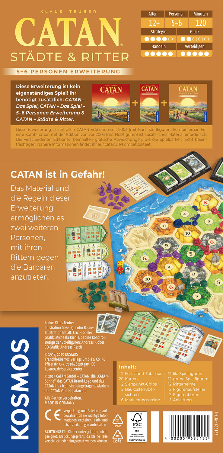 Die Städte auf Catan werden weiter ausgebaut, Stadtmauern und Metropolen entstehen. Mit dem Wohlstand kommen neue Herausforderungen: Wilde Barbaren greifen Catan an! Mutige Ritter entwickeln Strategien, um die Angreifer in die Flucht zu schlagen. Zwei zusätzliche Figurenaufsteller, weiteres Spielmaterial und neue Regeln ermöglichen es fünf bis sechs Spielerinnen und Spielern mit ihren Rittern gegen die Barbaren anzutreten. Zum Spielen der Erweiterung sind CATAN – Das Spiel, die Ergänzung von CATAN – Das Spiel für fünf bis sechs Spielerinnen und Spieler ab zwölf Jahren und die Erweiterung „Städte und Ritter“ notwendig. Siedeln, handeln, bauen: der Klassiker mit noch mehr Spannung! Diese Ausgabe von CATAN – Städte & Ritter lässt sich mit älteren Ausgaben kombinieren – neue Karten-Sets sind online auf www.catanshop.de erhältlich.