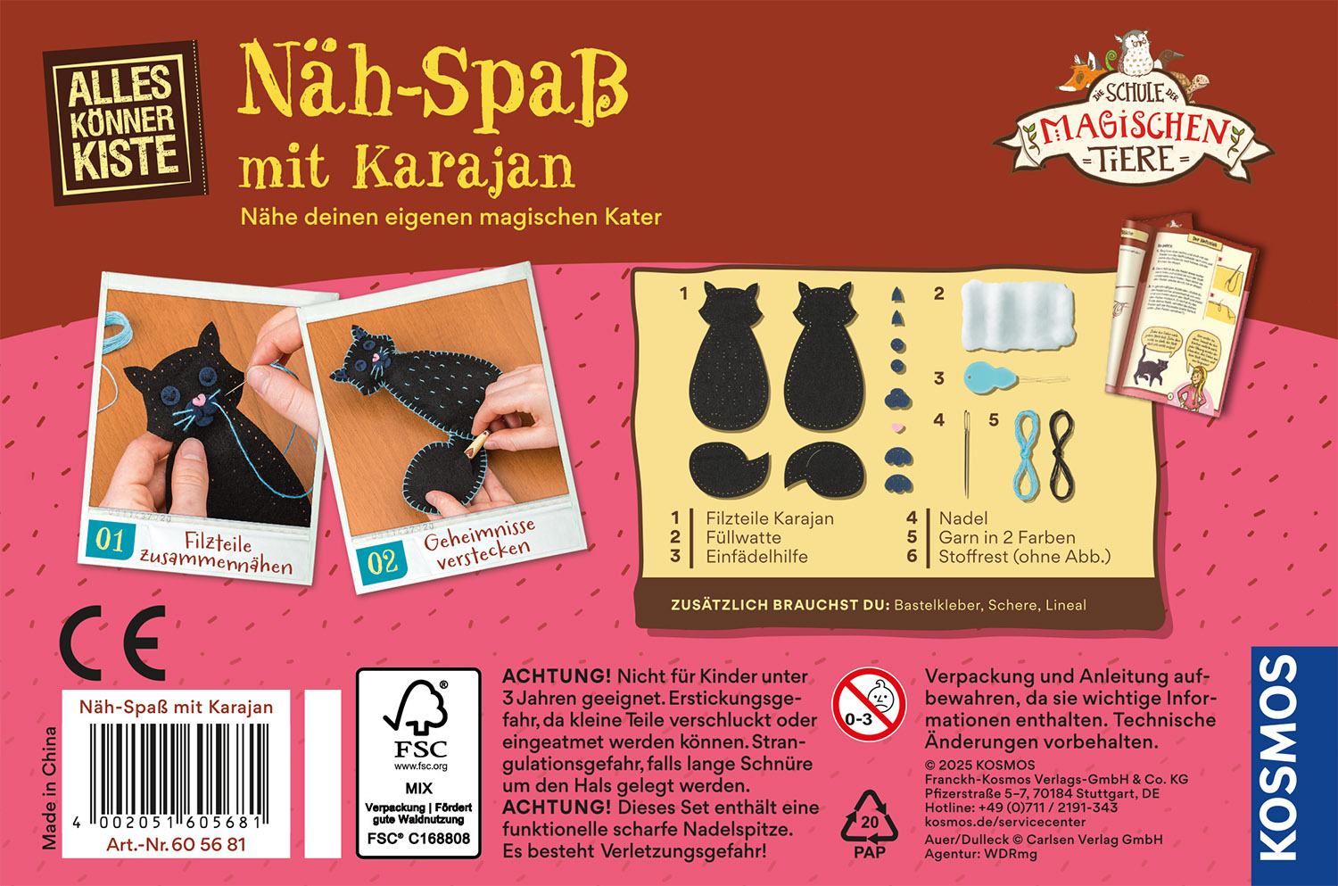 Karajan schleicht durchs Kinderzimmer! Der magische Kater aus der Kinderbuchreihe „Die Schule der magischen Tiere“ zum Selbernähen. Wie gelingt der Anfangsknoten? Was ist beim Heftstich zu beachten? Die bunt illustrierte Anleitung erklärt anschaulich die Grundtechniken des Nähens. Einfach die Filzteile entlang der vorgestanzten Löcher mit Nadel und Garn zusammennähen. Das magische Tier mit Füllwatte befüllen. Fertig! Kinderleicht entsteht ein 15 Zentimeter großer Begleiter mit einem unsichtbaren Extra: Im Schwanz des Katers befindet sich eine kleine Tasche für geheime Notizen. Ein cooles Geschenk für Kinder ab acht Jahren!