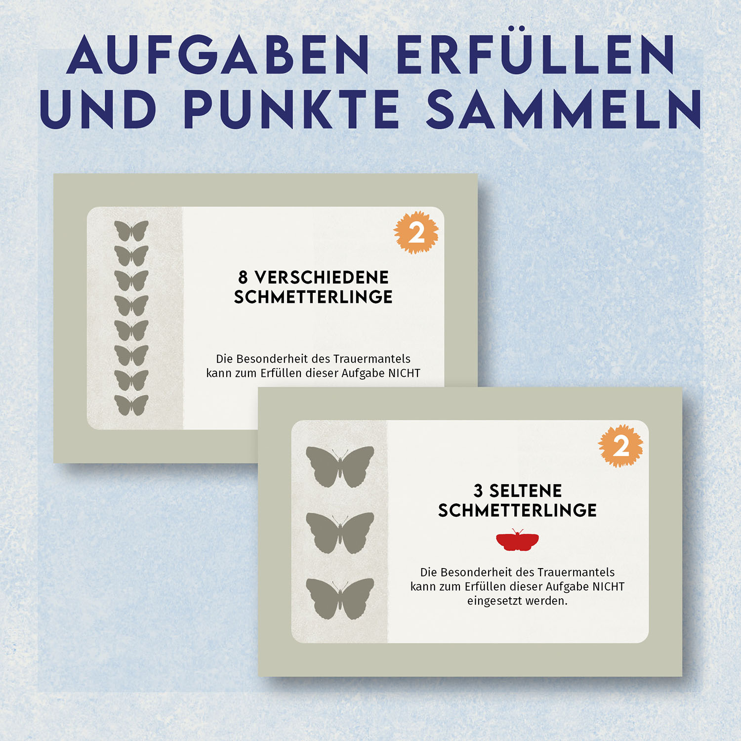 Schmetterlinge fliegen umher! Sie haben unterschiedliche Effekte und geben Punkte. Zwei bis fünf Spielerinnen und Spieler ab zehn Jahren spielen mit denselben Karten und bedienen sich aus einer gemeinsamen Auslage. Runde für Runde ziehen oder spielen sie eine Karte und erweitern die eigene Blumenwiese. Oder sie spielen die Karte als Schmetterling in die eigene Blumenwiese und nutzen ihre vielfältigen Besonderheiten. Ein immer wieder spannendes, schnelles Kartenspiel mit einfachen Aktionen und viel Spieltiefe für die ganze Familie.