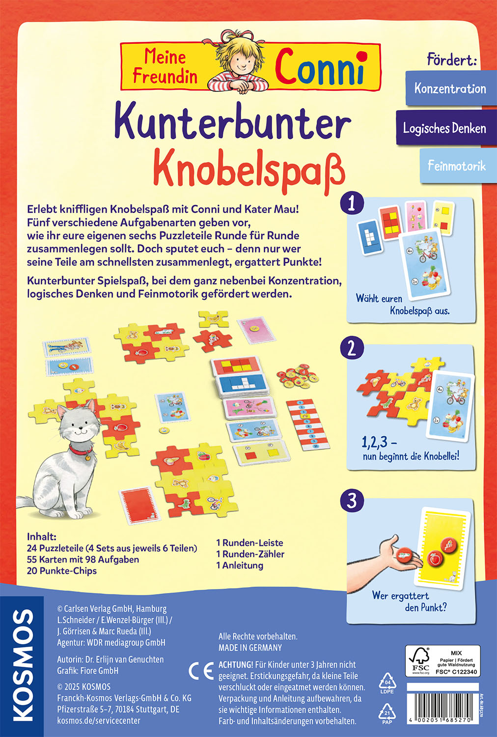 Hmm…mal überlegen…wie können die Puzzleteile geschickt und schnell zusammengelegt werden? Spielerisch räumliches und logisches Denken fördern beim Spielen mit Conni und Kater Mau. Ein bis vier Kinder ab vier Jahren erhalten jeweils das gleiche Set aus sechs beidseitig bedruckten Puzzleteilen. Die Aufgabenkarten verraten, wie die Teile zusammengelegt werden. Wer knobelt am schnellsten und sammelt die meisten Punkte? Um die Schwierigkeit anzupassen, können die Aufgaben zudem unterschiedlich kombiniert werden. Liebevoll gestaltete Puzzleteile mit Motiven aus der beliebten Kinderbuchreihe „Meine Freundin Conni“ runden das tolle Spielerlebnis ab. Ein schönes Geschenk mit Lernfaktor für die Kleinsten.