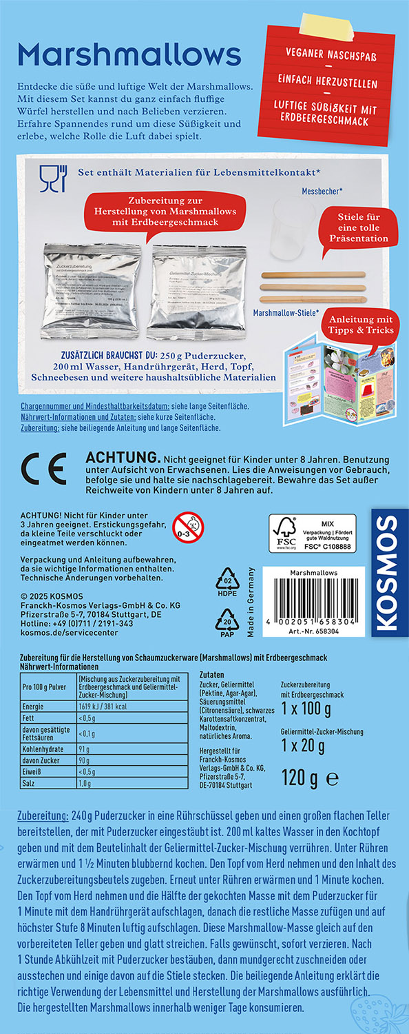 So lecker war experimentieren noch nie! Mit dem Rezept für Erdbeer-Marshmallows lässt sich ganz einfach naschen und forschen. Die Mischung wird aufgekocht und anschließend mit Zucker verrührt, wodurch die Masse fluffig wird und die typische Marshmallow-Konsistenz erhält. Nach dem Abkühlen kann die köstliche Masse in kleine Würfel oder kreative Formen geschnitten werden. Neben dem Naschen gibt es spannendes Hintergrundwissen zu den Themen Zucker und Geliermittel. Dabei wird auch entdeckt, welche Rolle Luft bei der Herstellung von Marshmallows spielt. Der besonders leckere KOSMOS Experimentierkasten.