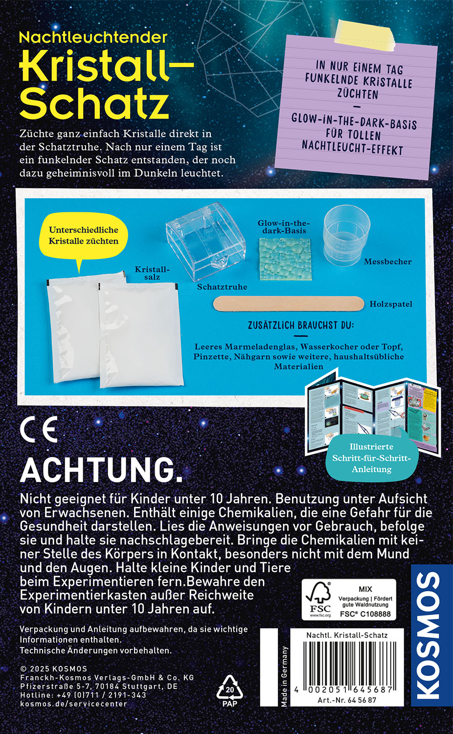 Glitzernde Kristalle, die im Dunkeln leuchten: Mit diesem Experimentierset züchten Kinder ab zehn Jahren ihren eigenen nachtleuchtenden Kristall-Schatz. Die Handhabung ist dabei einfach und besonders zuverlässig: Ist die Alaun-Kristalllösung einmal angerührt, wird sie in die eigens dafür vorgesehene Schatztruhe gefüllt und schon nach wenigen Stunden kann man dem Kristall-Schatz beim Wachsen zuschauen. Die besondere Bodeneinlage der Truhe sorgt für ein mystisches Leuchten der transparenten Kristalle im Dunkeln. So wird jedes Kinderzimmer zur geheimnisvollen Schatzkammer!