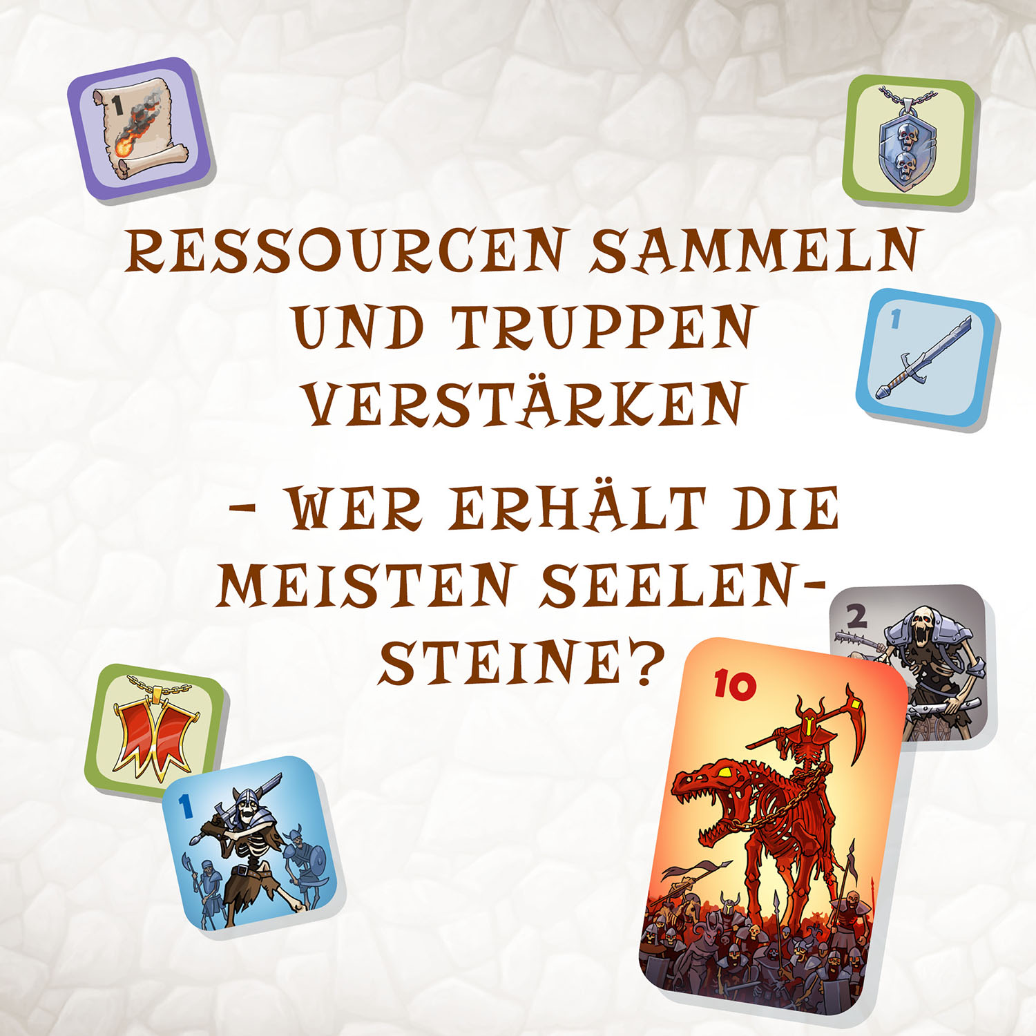 Neue Monster ziehen durch das Land der Burg Karak! Im eigenständigen Nachfolger von Karak warten neue und anspruchsvollere Herausforderungen auf die Spielerinnen und Spieler ab zehn Jahren. Sie schlüpfen in die Rollen von Heldinnen und Helden und versuchen, Monster zu besiegen, unter denen sich auch der mächtige Dunkle General befindet. Dafür müssen Ressourcen gesammelt, die Stadt erweitert und natürlich auch die Truppen verstärkt werden. Im strategischen Familienspiel warten schneller Spielspaß und epische Würfelwettkämpfe gegen unzählige neue Monster. Wer schafft es, die meisten Seelensteine und somit ewigen Ruhm zu erlangen?