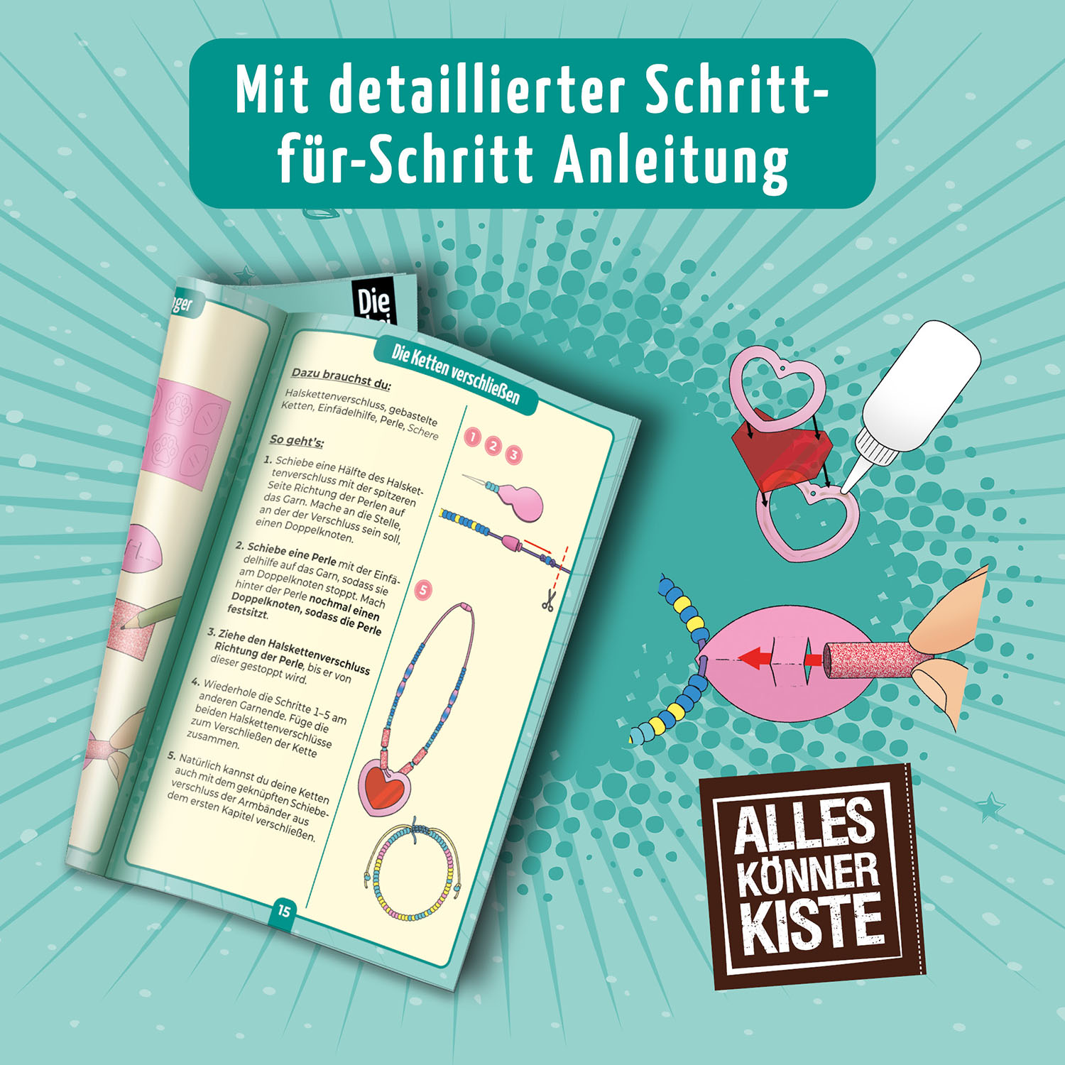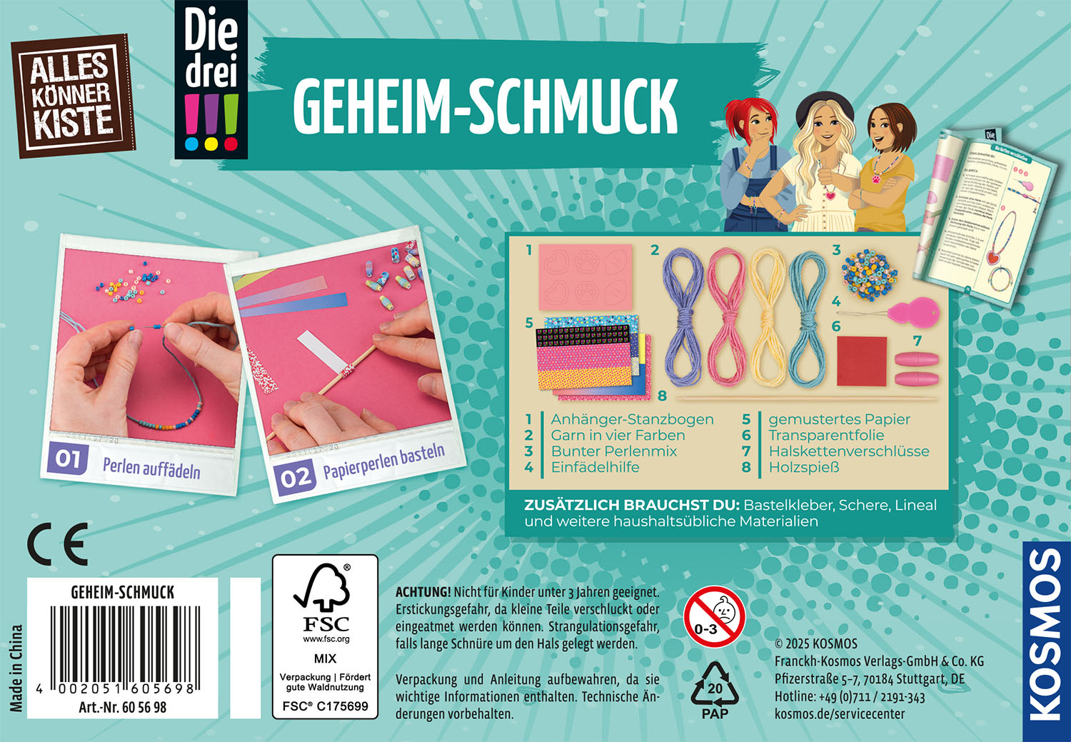 Strich, Punkt, Strich, Punkt: Welcher Buchstabe ist das? Wie lautet die geheime Botschaft? Mit der AllesKönnerKiste coole Morsecode Armbänder und -Ketten mit Kim, Franzi und Marie von den die Drei !!! gestalten. Wie das geht? Die anschauliche Schritt-für-Schritt Anleitung zeigt, wie man den individuellen Geheim-Schmuck für sich und eine Freundin oder einen Freund anfertigt. Die Buchstaben aus dem Morse-Alphabet heraussuchen und die bunten Perlen mit der Nadel auf Garn fädeln. Besonders cool: Eigene Papierperlen mit Geheimmuster herstellen! Was steht auf den Perlen drauf? Mit selbstgebastelten Folienanhängern lassen sich die geheimen Botschaften entschlüsseln. Angesagter Freundschaftsschmuck für Hobby-Detektivinnen, der cool aussieht und einzigartig ist.