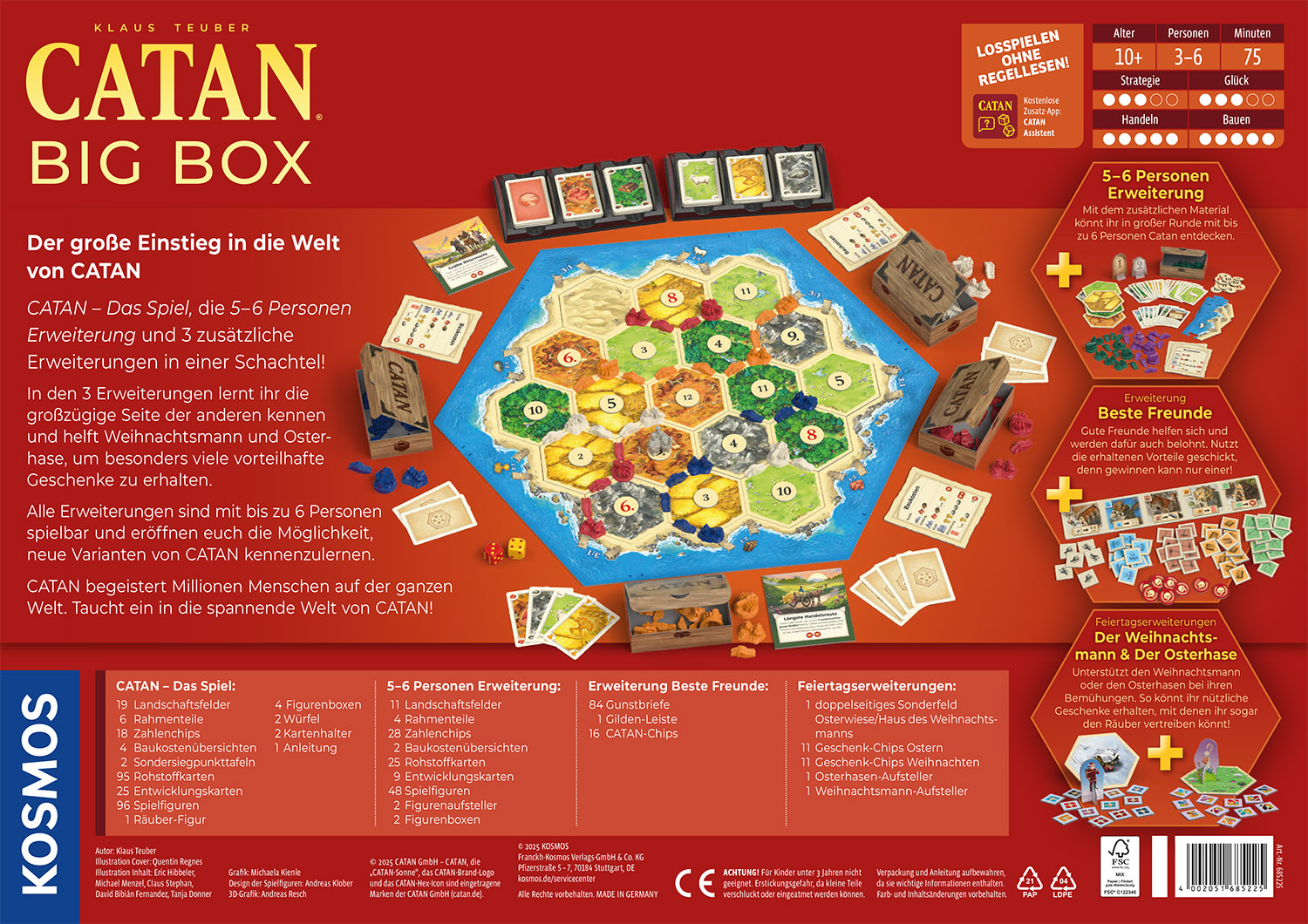 Der große Start in die Welt von CATAN! Eine Box für noch mehr Abwechslung und Abenteuer mit CATAN – Das Spiel, der 5–6 Personen Erweiterung zu CATAN – Das Spiel und den drei Bonus-Erweiterungen Beste Freunde, Der Osterhase und Der Weihnachtsmann. Mit drei bis sechs Personen könnt ihr gemeinsam in die Welt von CATAN eintauchen und euch als mutige Entdecker in CATAN – Das Spiel auf der Insel niederlassen. Durch geschickten Rohstoffhandel steigert ihr kontinuierlich euren Wohlstand und könnt so immer mehr Straßen, Siedlungen und Städte errichten. Die drei Bonus-Erweiterungen Beste Freunde, Der Weihnachtsmann und Der Osterhase lassen Spielerinnen und Spieler noch tiefer in die fantasievolle Welt von Bestseller-Spieleautor Klaus Teuber eintauchen und bringen Abwechslung ins Spiel. Der perfekte Einstieg für Spielerinnen und Spieler ab zehn Jahren – super geeignet als Geschenk für alle Neueinsteiger.