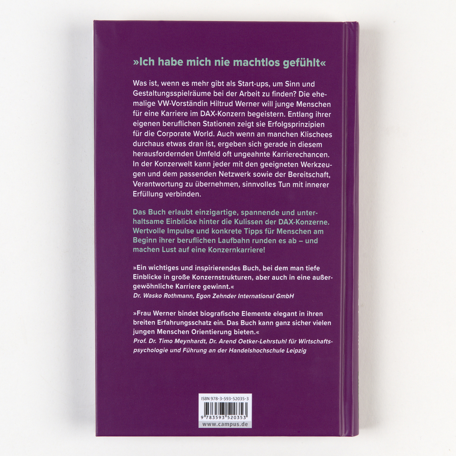 Was ist, wenn es mehr gibt als Start-ups, um Sinn und Gestaltungsmöglichkeiten bei der Arbeit zu finden? Die ehemalige VW-Vorständin Hiltrud Werner will junge Menschen für eine Karriere im DAX-Konzern begeistern. Entlang ihrer eigenen beruflichen Stationen zeigt sie Erfolgsprinzipien für die Corporate World, die aus ihrer Sicht enorme Chancen für die Karriere bietet. Auch wenn an manchen Negativklischees durchaus etwas dran ist, ergeben sich gerade in einem herausfordernden Umfeld oft spannende Gestaltungsmöglichkeiten. In der Konzernwelt braucht sich niemand machtlos zu fühlen, sondern kann mit der richtigen Haltung, geeigneten Werkzeugen und dem passenden Netzwerk eine Karriere gestalten, die sinnvolles Tun mit innerer Erfüllung verbindet.