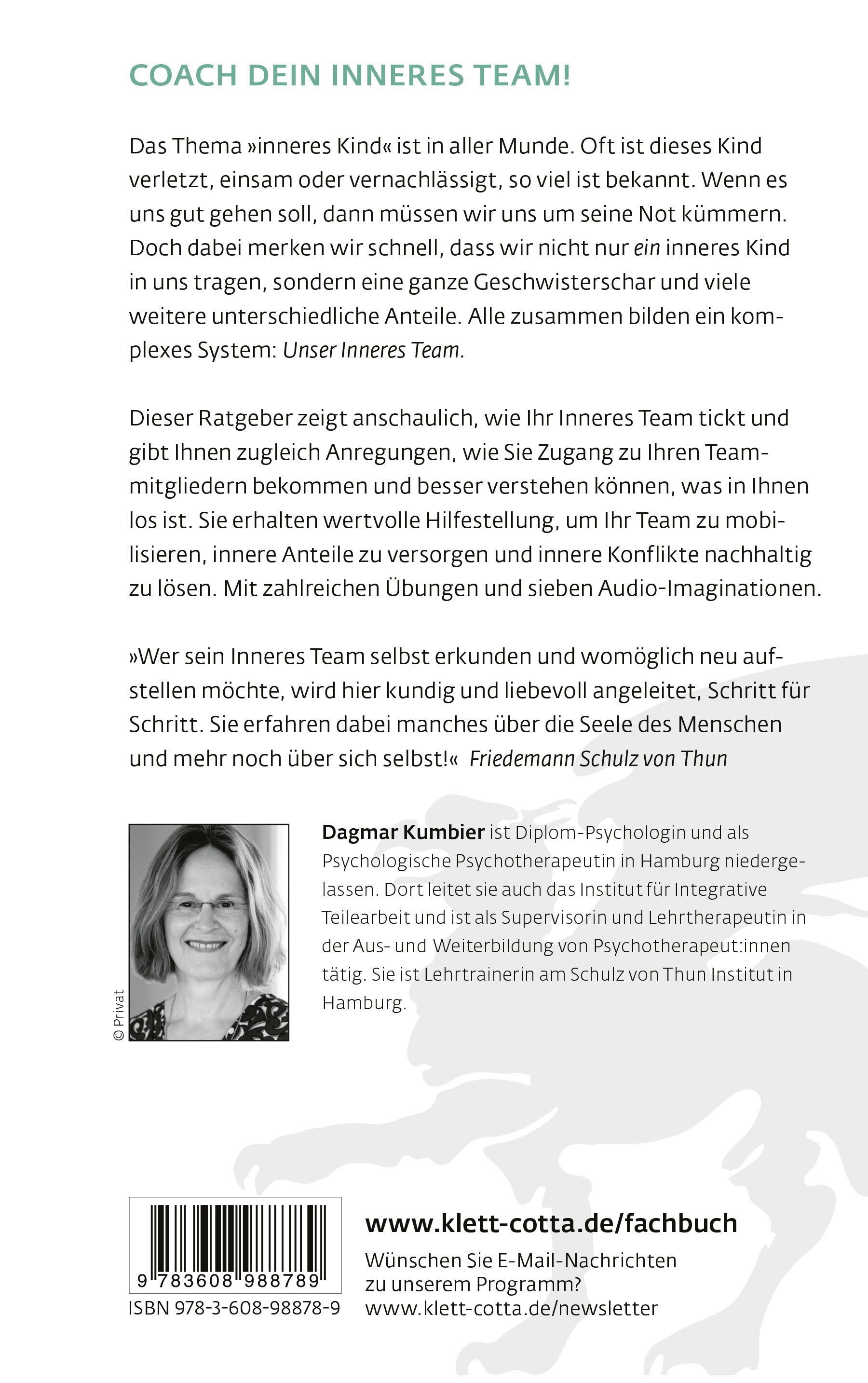 Dagmar Kumbier, Diplom-Psychologin und Geisteswissenschaftlerin, ist als Psychologische Psychotherapeutin in Hamburg niedergelassen. Sie war Mitarbeiterin von Friedemann Schulz von Thun an der Universität Hamburg und als Psychotherapeutin in Kliniken tätig (Schwerpunkt Traumatherapie). Heute leitet sie das Institut für Integrative Teilearbeit in Hamburg, ist Lehrtrainerin am Schulz-von-Thun-Institut und als Dozentin, Supervisorin und Lehrtherapeutin in der Aus- und Weiterbildung von Psychotherapeuten tätig.>> Das Institut für integrative Teilearbeit im Internet>> Dagmar Kumbier im Internet