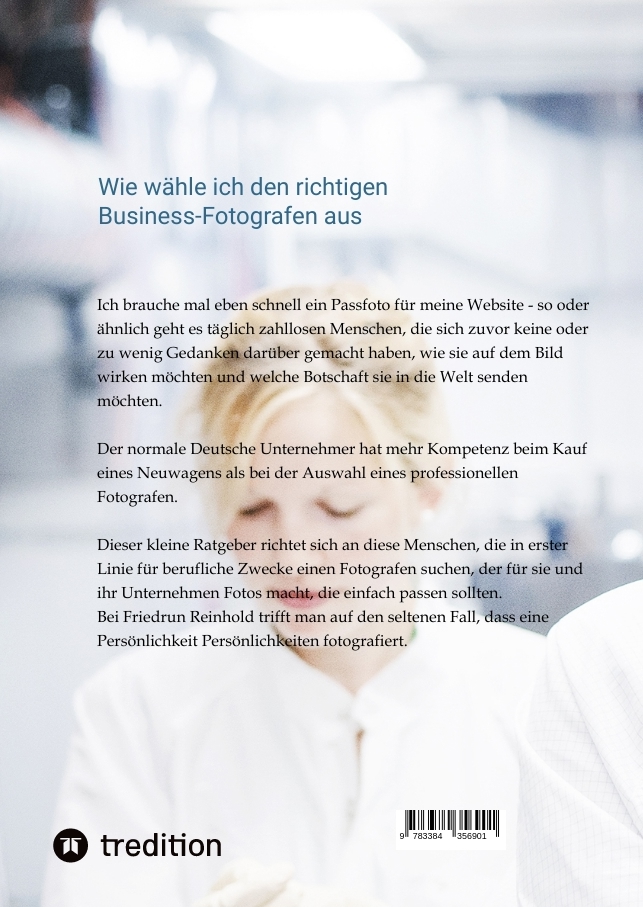 Ich brauche mal eben schnell ein Passfoto für meine Website - so oder ähnlich geht es täglich zahllosen Menschen, die sich zuvor keine oder zu wenig Gedanken darüber gemacht haben, wie sie auf dem Bild wirken möchten und welche Botschaft sie in die Welt senden möchten.Der normale Deutsche Unternehmer hat mehr Kompetenz beim Kauf eines Neuwagens als bei der Auswahl eines professionellen Fotografen.Dieser kleine Ratgeber richtet sich an diese Menschen, die in erster Linie für berufliche Zwecke einen Fotografen suchen, der für Sie und Ihr Unternehmen Fotos macht, die einfach passen sollten.Bei Friedrun Reinhold trifft man auf den seltenen Fall, dass eine Persönlichkeit Persönlichkeiten fotografiert. Er ist mit seinen Fotos international ausgezeichnet, Autor von Fachbüchern und zahllosen Artikeln in der Fachpresse, inspirierender Workshopleiter und hatte viele Jahre einen Lehrauftrag an der Universität in Karlsruhe. Seine Fotos werden regelmäßig in Ausstellungen gezeigt.Im vorliegenden Ratgeber fasst er die zahllosen Fragen seiner Kunden zusammen, damit auch Ihre Fotosession ein voller Erfolg wird.
