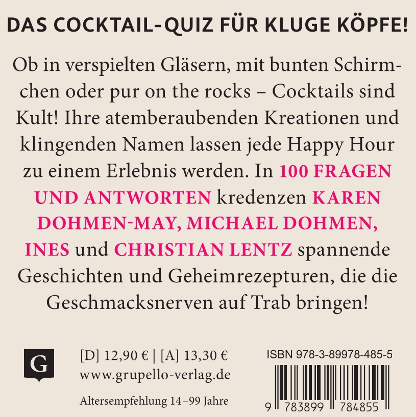 Ob in verspielten Gläsern, mit bunten Schirmchen oder pur on the rocks - Cocktails gibt es für jeden Geschmack. Hobbymixer in der heimischen Küche zaubern ebenso wie Profis an der Bar köstliche Kreationen aus Spirituosen und Säften. Doch wer hat eigentlich den ersten Cocktail gemixt? Und warum wird James Bonds Martini geschüttelt und nicht gerührt? Hier heißt es: Miträtseln und neben den Geschmacksnerven auch die Gehirnzellen auf Trab bringen!Stilvoll, elegant und immer eine gute Idee: Die Reihe "Quiz im Quadrat" präsentiert sich in modernem Design und sorgt für unterhaltsamen Rätselspaß - verpackt in einer edlen Geschenkbox. Perfekt als besondere 'Grußkarte' mit Mehrwert - zum Verschenken oder Selberfreuen!