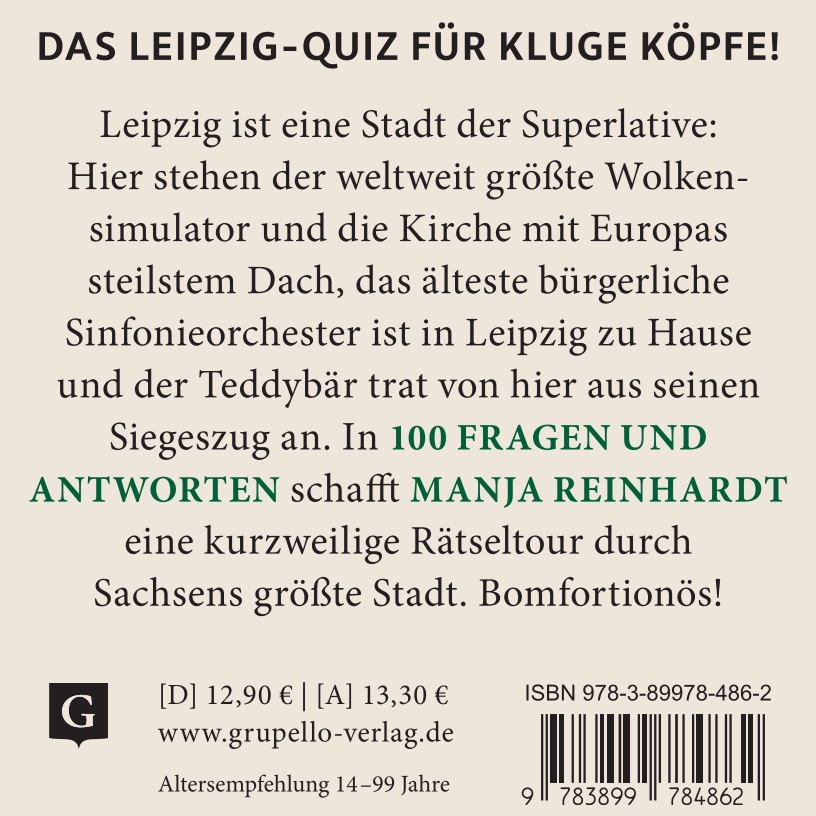 Leipzig ist eine Stadt der Superlative: Hier stehen der weltweit größte Wolkensimulator und die Kirche mit Europas steilstem Dach, das älteste bürgerliche Sinfonieorchester ist in Leipzig zu Hause und der Teddybär trat von hier aus seinen Siegeszug an. Überall finden sich spannende Fakten, witzige Details und kuriose Anekdoten. 100 davon greift Manja Reinhardt in unterhaltsamen Fragen und Antworten auf und schafft so eine kurzweilige Rätseltour durch Sachsens größte Stadt.Stilvoll, elegant und immer eine gute Idee: Die Reihe "Quiz im Quadrat" präsentiert sich in modernem Design und sorgt für unterhaltsamen Rätselspaß - verpackt in einer edlen Geschenkbox. Perfekt als besondere 'Grußkarte' mit Mehrwert - zum Verschenken oder Selberfreuen!