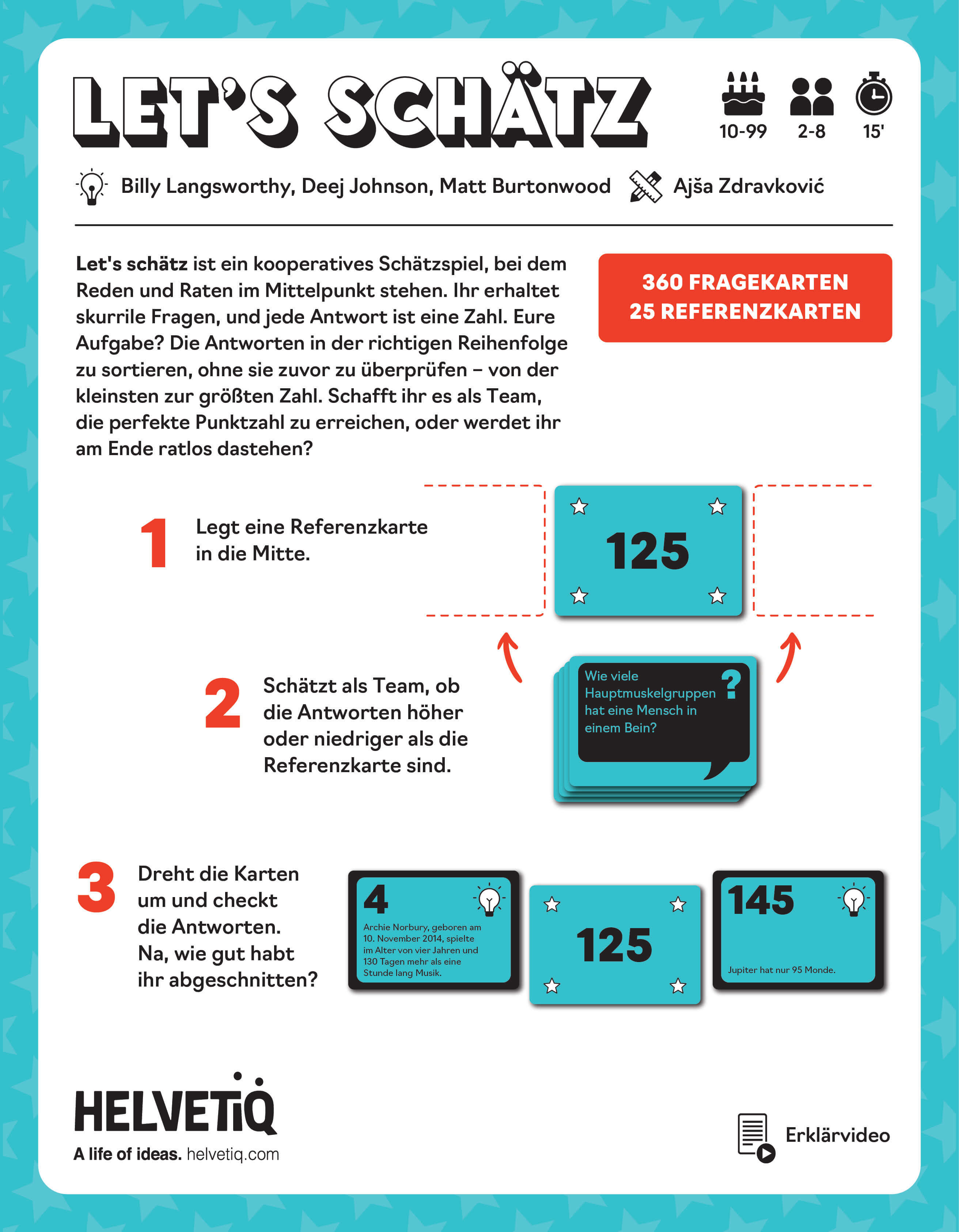 | Schlagworte | familienfreundlich • fun facts • Kommunikation • kooperativ • Lustige Fakten • Partyspiel • Raten • Schätzen • Wissen |