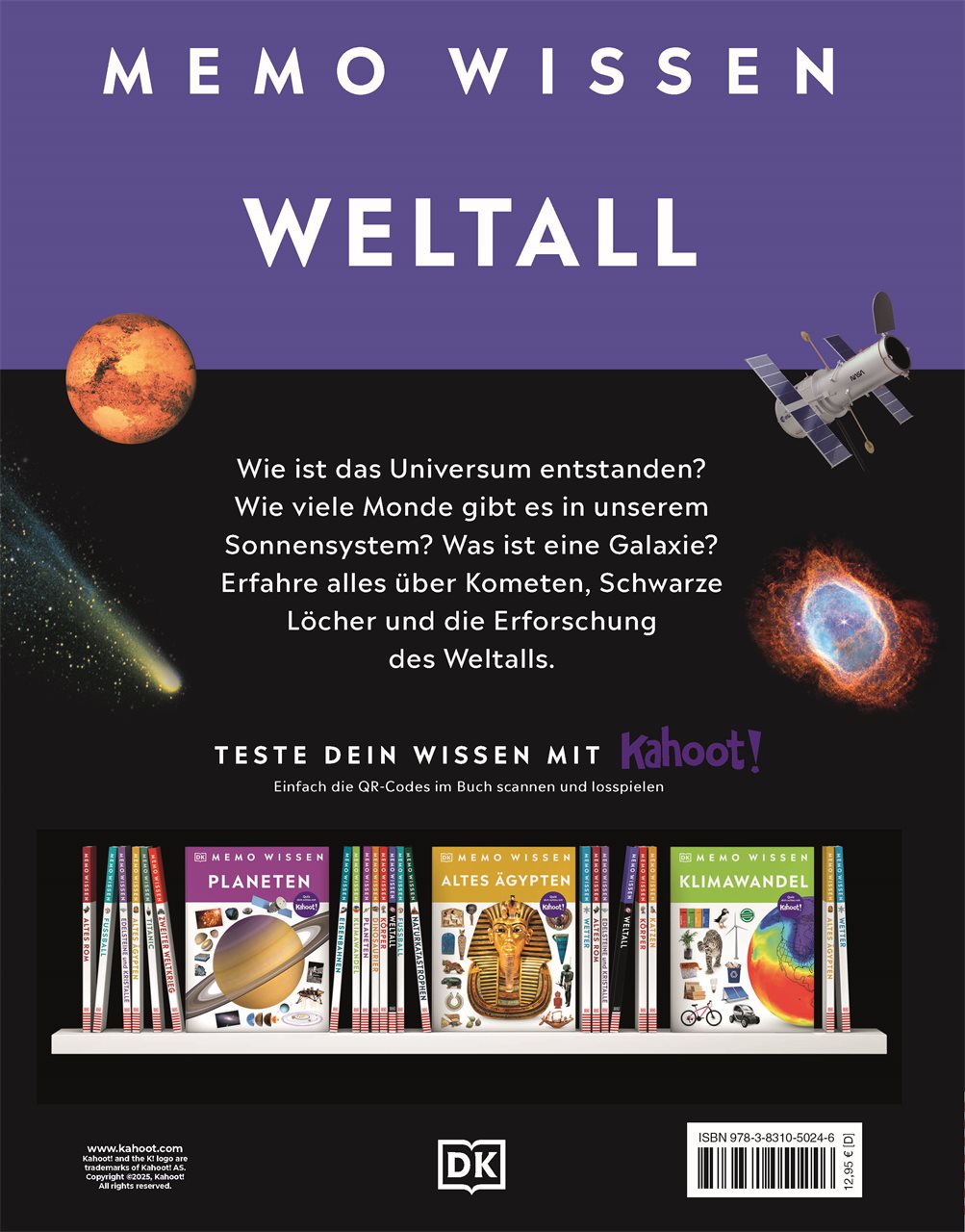 | Schlagworte | Asteroid • Astronauten • Astronomie für Kinder • Buch ab 10 Jahren • Buch ab 8 Jahren • Erde • Galaxie • Jupiter • kahoot deutsch • kahoot quiz • kahoot spielen • Kinderbuch Astronomie • Kinderbuch Planeten • Kinderbuch Weltall • Kinderbuch Weltraum • Kindersachbuch • Komet • Mars • memo bücher • memo weltall • memo wissen entdecken • Merkur • Meteorit • Milchstraße • Monde • Neptun • online spielen • Quiz • Raumfahrt • Sachbücher für Kinder • Sachbücher für Kinder ab 8 • Sachwissen Kinder • Schwarze Löcher • Sonnensystem • Universum • Weltall • Weltraum • Weltraumforschung • Wissen entdecken • Wissen für Kinder • wissen kinderbücher |