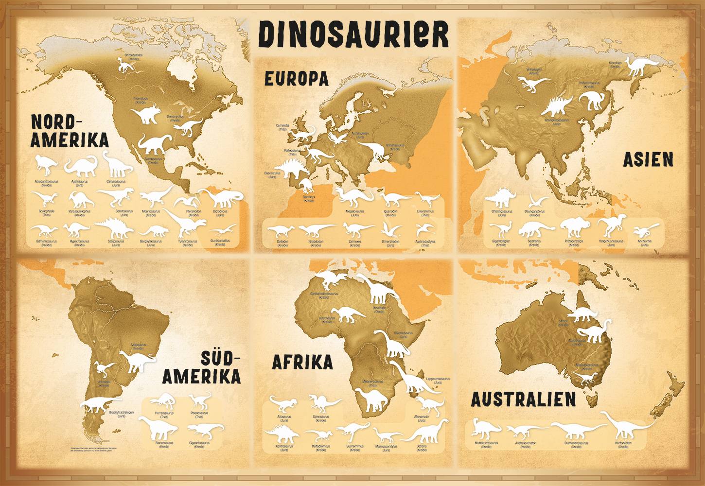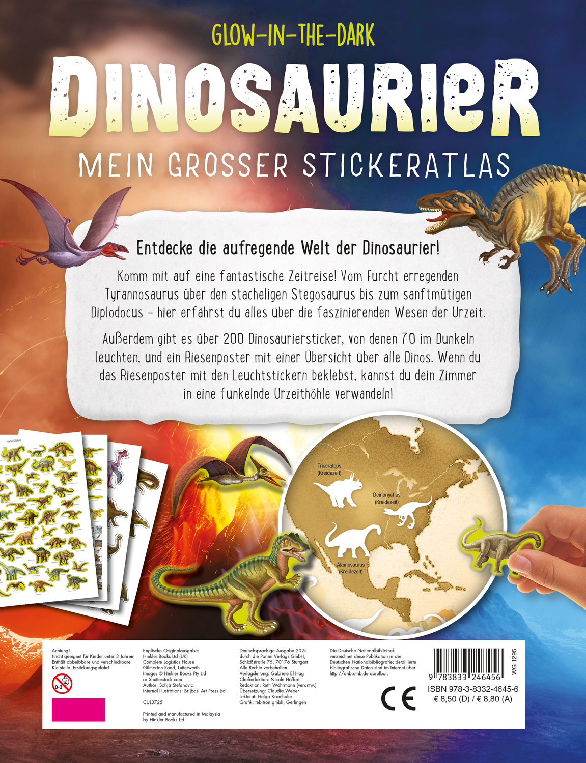 | Zusatzinfo | Durchgehend vierfarbig; über 200 Dino-Stickern verteilt auf 4 Bögen, davon 70 Leucht-Sticker zum Aufkleben auf Weltkarte (Abmessungen Poster: ca. 54,5 x 79 cm; gefaltet: ca. 20 x 27,5 cm) |