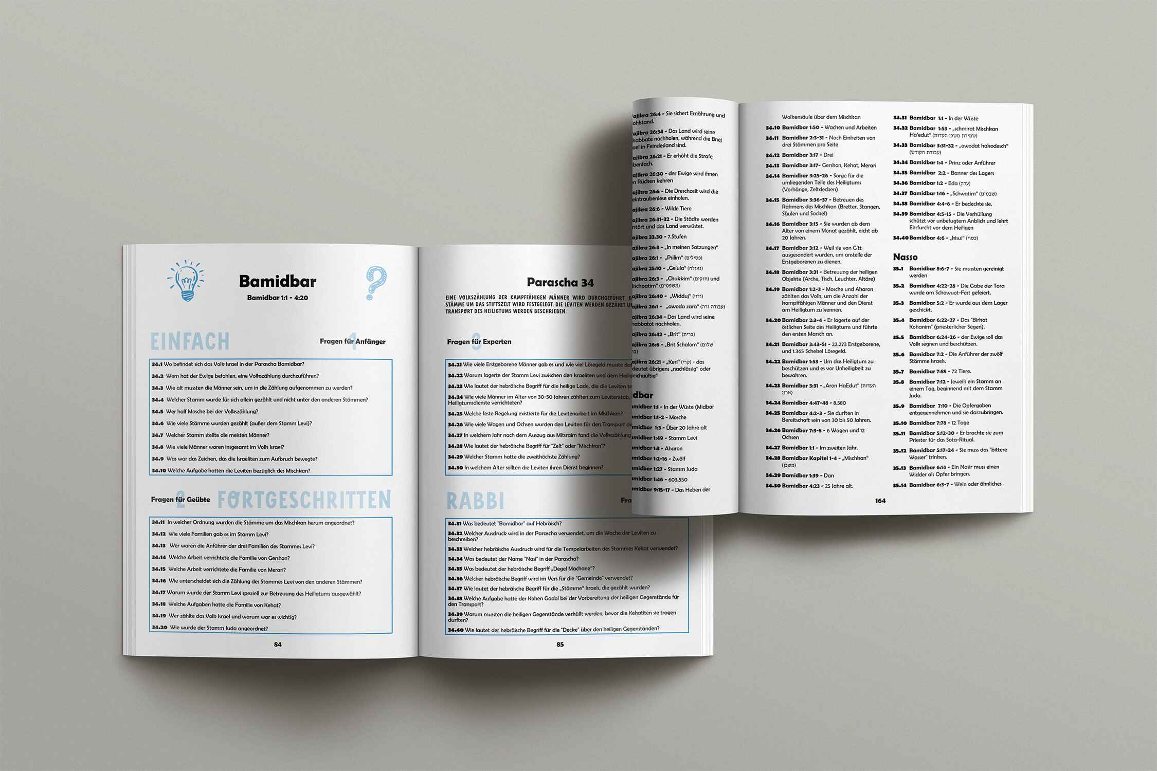Jede Parascha ist in 4 Schwierigkeitsstufen mit jeweils 10 Fragen unterteilt, so dass sowohl für Anfänger als auch für Experten etwas dabei ist. Natürlich sind auch die Lösungen der Fragen dabei (Textstelle + Antwort).