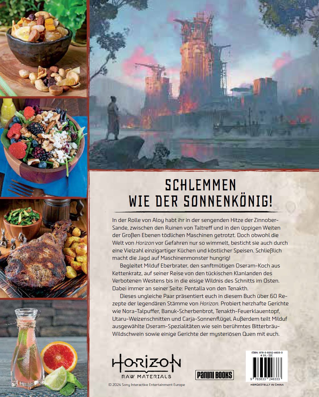 SCHLEMMEN WIE DER SONNENKÖNIG! In der Rolle von Aloy habt ihr in der sengenden Hitze der Zinnober-Sande, zwischen den Ruinen von Taltreff und in den üppigen Weiten der Großen Ebenen tödlichen Maschinen getrotzt. Doch obwohl die Welt von Horizon vor Gefahren nur so wimmelt, besticht sie auch durch eine Vielzahl einzigartiger Küchen und köstlicher Speisen. Schließlich macht die Jagd auf Maschinenmonster hungrig! Begleitet Milduf Eberbrater, den sanftmütigen Oseram-Koch aus Kettenkratz, auf seiner Reise von den tückischen Klanlanden des Verbotenen Westens bis in die eisige Wildnis des Schnitts im Osten. Dabei immer an seiner Seite: Pentalla von den Tenakth. Dieses ungleiche Paar präsentiert euch in diesem Buch über 60 Rezepte der legendären Stämme von Horizon. Probiert herzhafte Gerichte wie Nora-Talpuffer, Banuk-Scherbenbrot, Tenakth-Feuerklauentopf, Utaru-Weizenschnitten und Carja-Sonnenflügel. Außerdem teilt Milduf ausgewählte Oseram-Spezialitäten wie sein berühmtes Bitterbräu-Wildschwein sowie einige Gerichte der mysteriösen Quen mit euch.