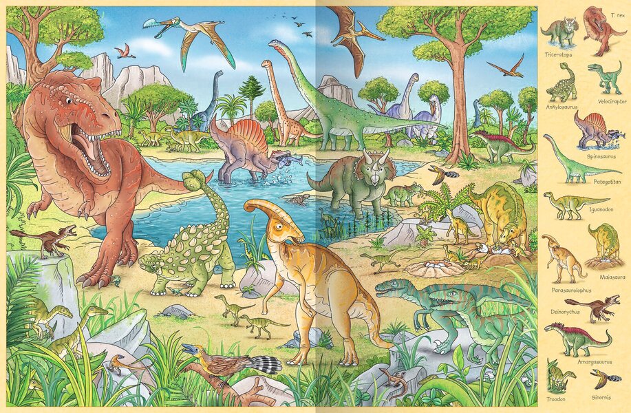 Pappbilderbuch mit spannenden Suchaufträgen für Kinder ab 3 Jahren. Coole und energievolle Szenen der Dinosaurier aus der Urzeit. Interessante Namen zu einzelnen Dinosauriern aus dem Wimmelbild. Spannende Suchaufträge am Ende des Buches motivieren zum Suchen und Entdecken. Kurze Texte bieten faszinierende Informationen zu einzelnen Dinosauriern.