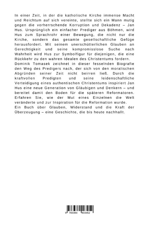 In einer Zeit, in der die katholische Kirche immense Macht und Reichtum auf sich vereinte, stellte sich ein Mann mutig gegen die vorherrschende Korruption und Dekadenz - Jan Hus. Ursprünglich ein einfacher Prediger aus Böhmen, wird Hus zum Sprachrohr einer Bewegung, die nicht nur die Kirche, sondern das gesamte gesellschaftliche Gefüge herausfordert. Mit seinem unerschütterlichen Glauben an Gerechtigkeit und seine kompromisslose Suche nach Wahrheit wird Hus zur Symbolfigur für diejenigen, die eine Rückkehr zu den wahren Idealen des Christentums fordern.Dominik Tomasek zeichnet in dieser fesselnden Biografie den Weg des Predigers nach, der sich von den moralischen Abgründen seiner Zeit nicht beirren ließ. Durch die kraftvollen Predigten und seine leidenschaftliche Verteidigung eines authentischen Christentums inspiriert Jan Hus eine neue Generation von Gläubigen und Denkern - und bereitet damit den Boden für die späteren Reformatoren. Erfahren Sie, wie der Mut eines Einzelnen die Welt veränderte und zur Inspiration für die Reformation wurde.Ein Buch über Glauben, Widerstand und die Kraft der Überzeugung - eine Geschichte, die bis heute nachhallt.
